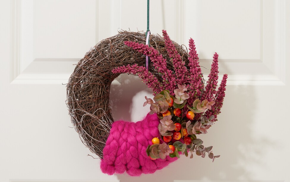 Najpierw podziel wełnę wróżki równomiernie na trzy pasma i zapleć je. Następnie owiń splot wokół wieńca z chrustu. Przymocuj początek i koniec do wieńca za pomocą gorącego kleju.