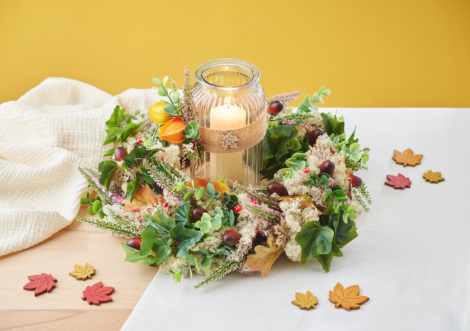 Aby wyróżnić szkło, umieść jeden lub więcej krążków drzewa w wieńcu i umieść szkło na górze. Krążki choinkowe sprawiają, że szkło wyróżnia się wizualnie i harmonijnie integruje się z ogólnym projektem.