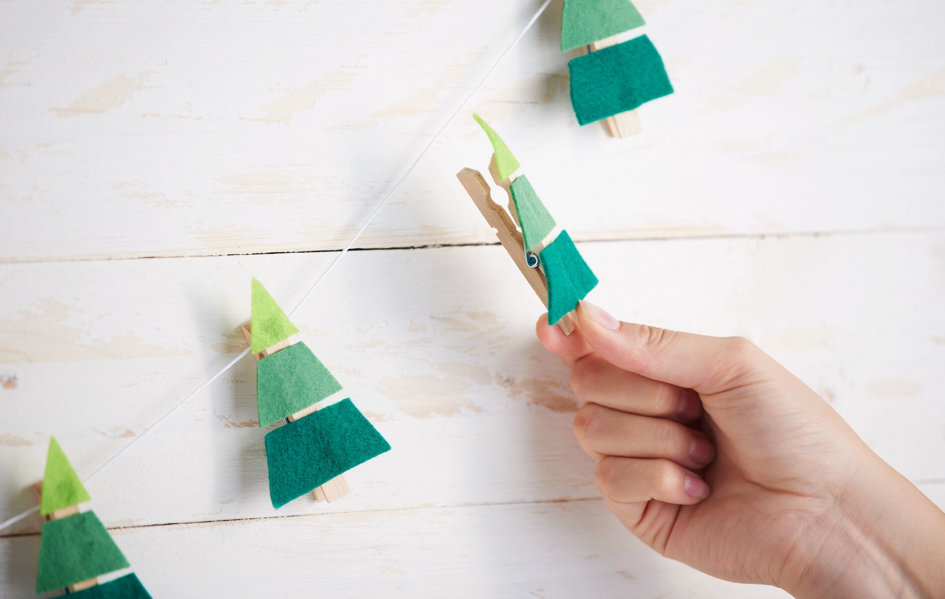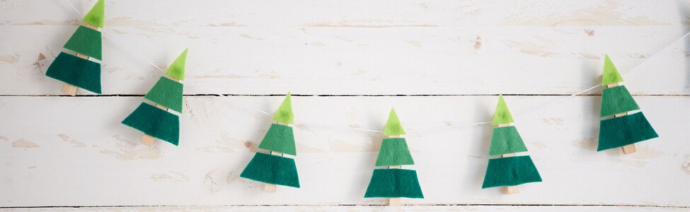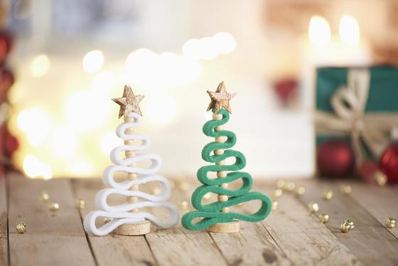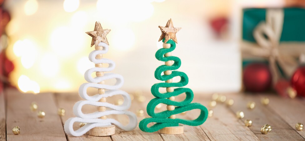 Drewnianymi koralikami tworząc choinkę. Jeśli filc nie jest łatwy do przebicia, wystarczy użyć szydła. Po osiągnięciu szczytu choinki, po prostu odetnij pozostałe paski filcu. Przyklej drut do wstępnie wywierconego otworu w dolnej części krążka kory i udekoruj wierzchołek ostatnią gwiazdą.