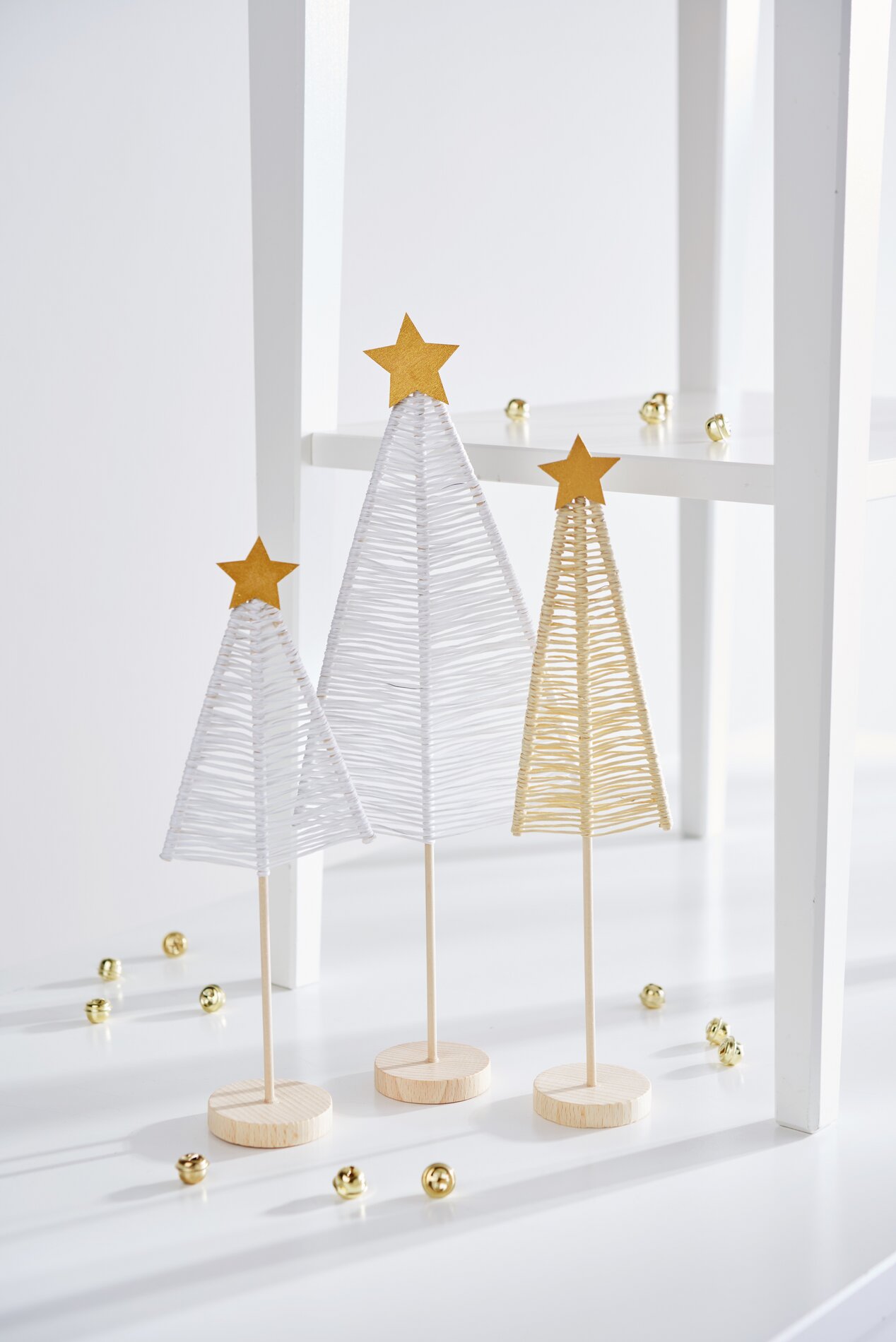 Następnym krokiem jest owinięcie ramy wybranym drutem papierowym. Zacznij od środka w następującej kolejności: owiń raz, owiń raz z prawej strony, owiń raz na środku, owiń raz z lewej strony, owiń raz na środku, owiń raz z prawej strony, owiń raz na środku, owiń raz z lewej strony.. Powtórz ten proces dla wszystkich jodeł. Przyklej końce okrągłych prętów po bokach klejem rzemieślniczym, aby drut nie odpadł.