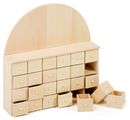 Kalendarz adwentowy wykonany z surowego drewna, o wymiarach ok. wys. 25,5 x szer. 24 x gł. 5,5 cm, z 24 szufladkami, o wymiarach wewnętrznych ok. gł. 4 x szer. 2,6 x wys. 2,4 cm, ze zdejmowaną kokardką.