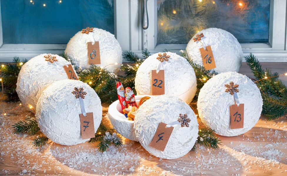 Na połówki styropianowych kulek nanieś obficie za pomocą pędzelka z włosia dekoracyjny śnieg i pozostaw wszystko do dokładnego wyschnięcia.
