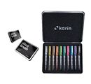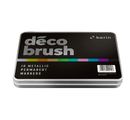 Zestaw 10 kolorów Karin Deco Brush Metallic na bazie metalicznych pigmentów. Zapewniają doskonałe krycie czarnych i białych powierzchni. Pisaki zawierają po 2,4 ml nietoksycznego koloru i są produkowane w technologii "płynnego tuszu". W przeciwieństwie do tradycyjnych pisaków, pozwala ona na 100% zużycie zawartego w nim koloru. Po wyschnięciu kolor jest trwały, odporny na światło i wodoodporny na powierzchniach takich jak papier, drewno, ceramika, szkło, metal i plastik. Wszystkie dekoracje i rysunki wykonane markerami Deco Brush są trwałe i pozostają odporne na działanie światła przez wiele lat. Pisaki wyposażone są w trwałą i elastyczną końcówkę w kształcie pędzelka. Materiał, z którego wykonana jest końcówka pędzelka to nylon poliestrowy.