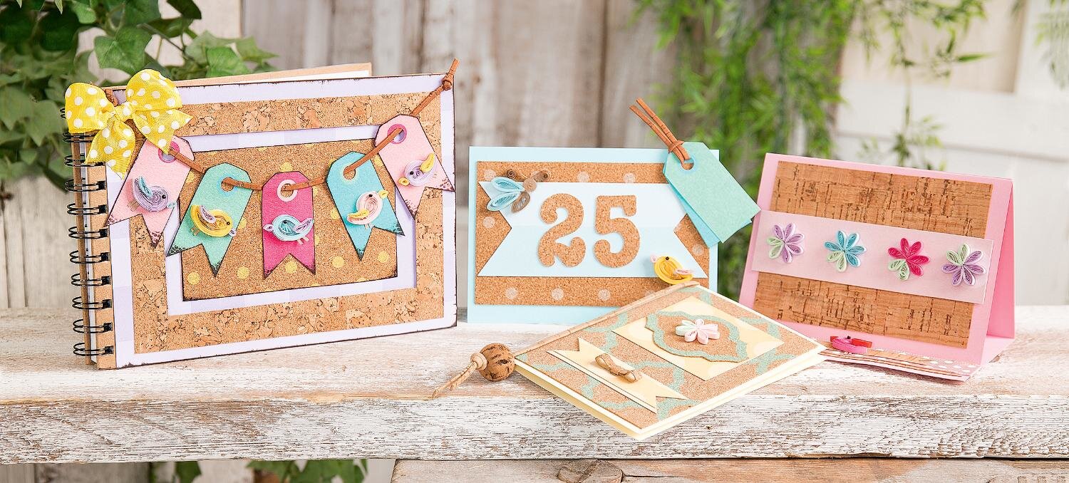 Kartki z życzeniami Puść wodze fantazji: wytnij papier korkowy, aby stworzyć ozdobną okładkę kartki. Po prostu przyklej kolorowy papier pasujący do kartki do korka jako ozdobną aplikację. Teraz możesz dowolnie ozdobić kartkę za pomocą liter z korka, wykrawanych motywów lub naklejek do quillingu.