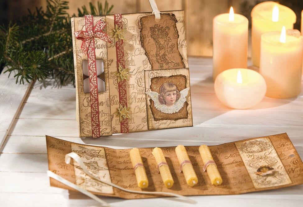 Przewlecz wstążkę przez szczeliny i przymocuj świeczki. Przyklej końce wstążki z tyłu kartki.