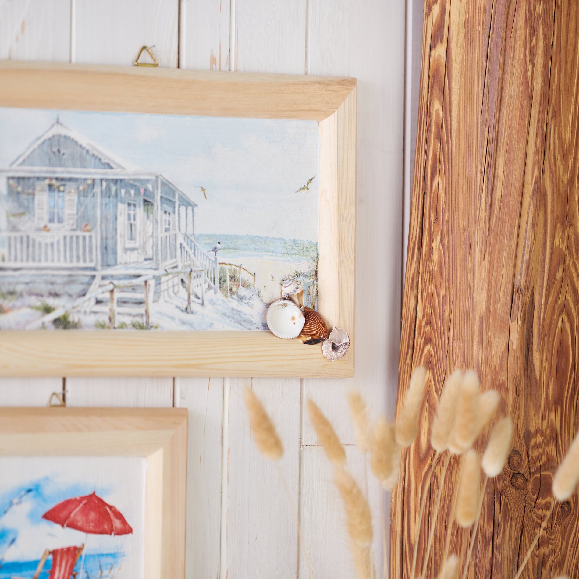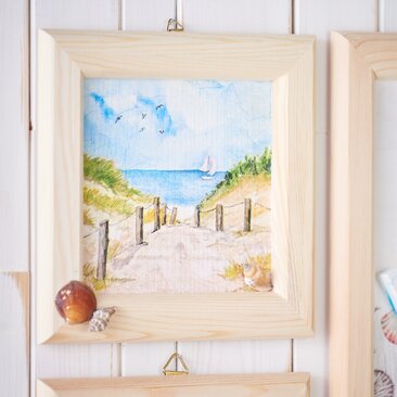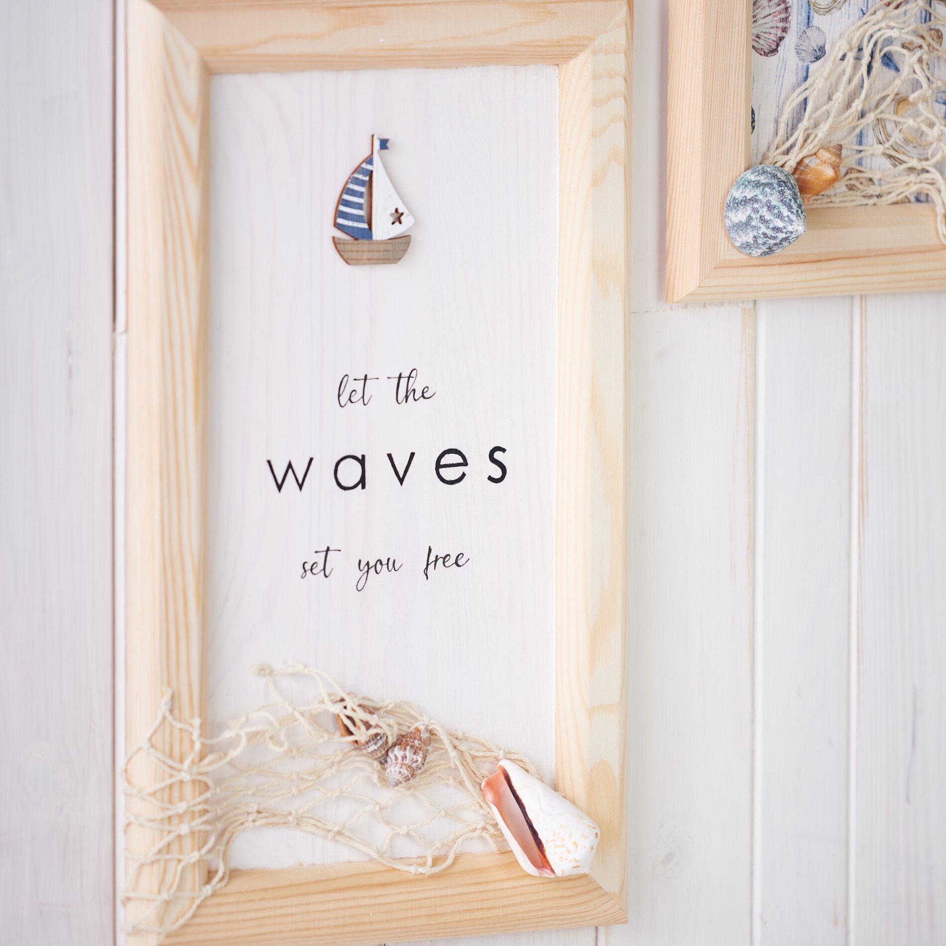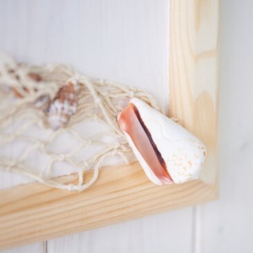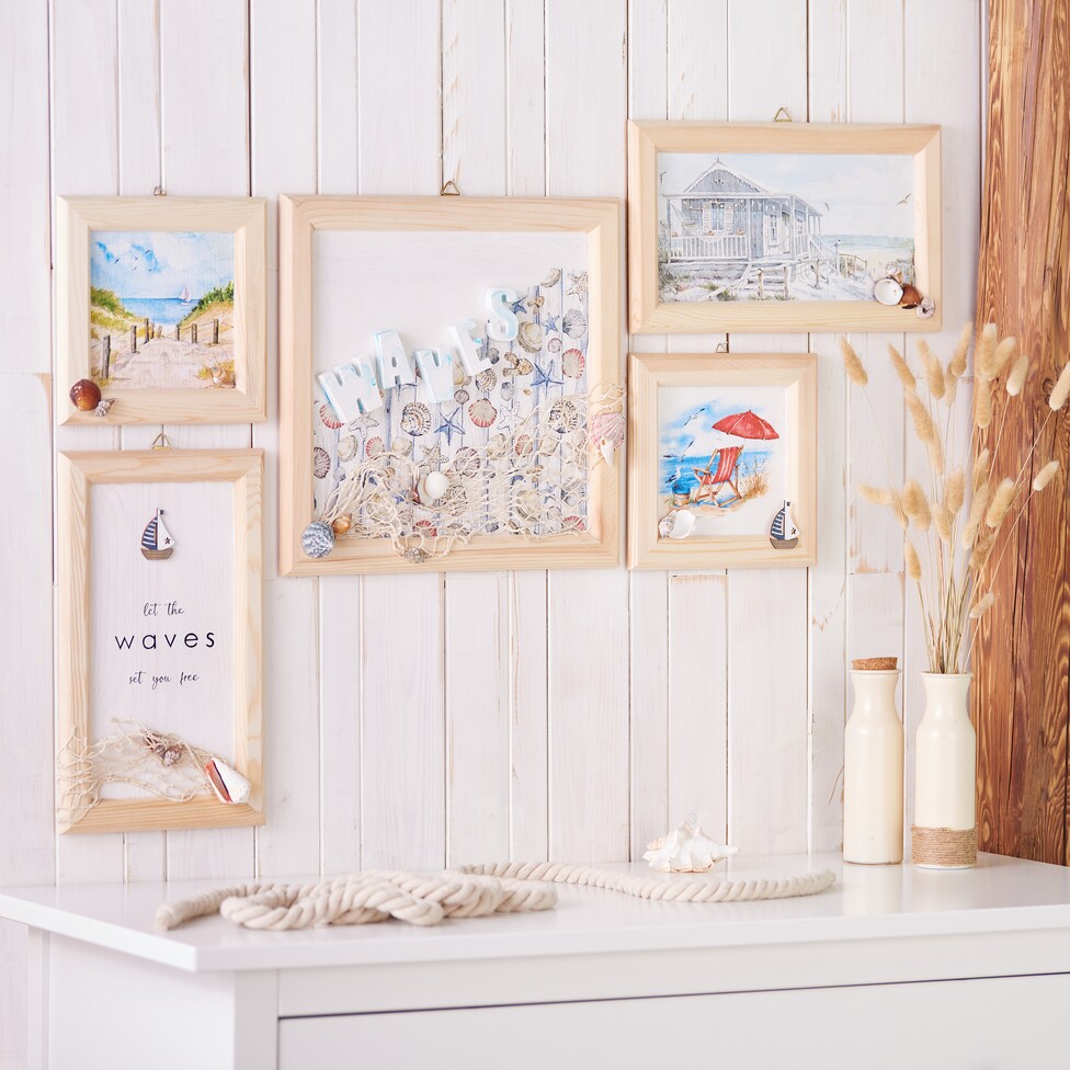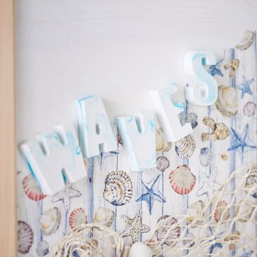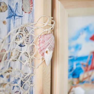 Teraz do gry wchodzą akcenty: możesz użyć ręcznego liternictwa, aby napisać inspirujące morskie powiedzenia bezpośrednio na ramkach. Następnie dodaj posypkę, sieć rybacką i muszle, aby nadać ramkom głębi i charakteru. Pamiętaj, aby umieścić dekoracje w harmonijnych proporcjach na ramce.