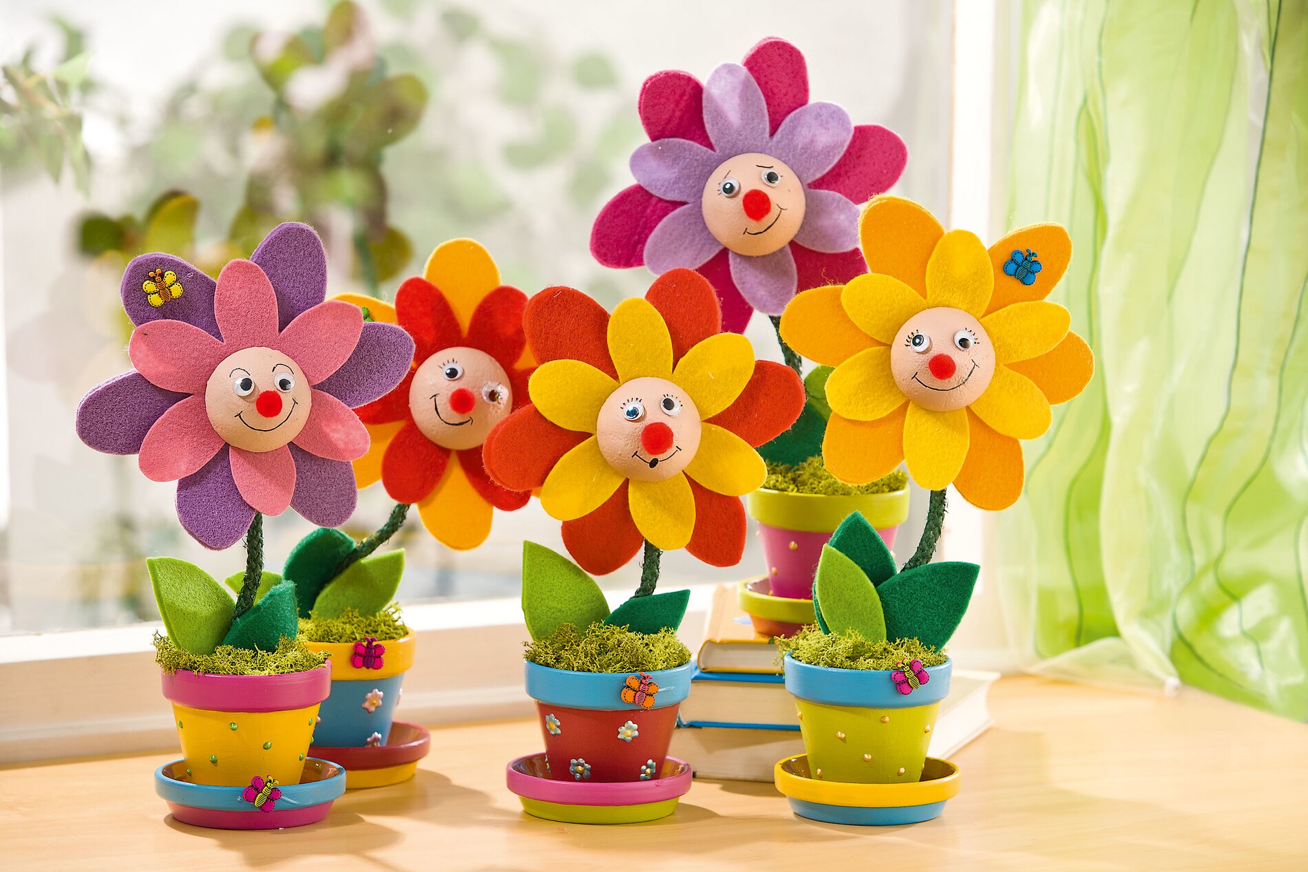 Działa to w następujący sposób: Najpierw pomaluj doniczki i spodki na jasne kolory. Gdy farba wyschnie, połóż doniczki i umieść na nich małe okrągłe koraliki jeden po drugim za pomocą perłowego pisaka. Zanim będziesz mógł kontynuować obracanie doniczki, musisz najpierw pozwolić perełkom odpowiednio wyschnąć, aby się nie rozmazały. Podczas gdy koraliki schną, przenieś szablony na twardy karton i użyj ich do wycięcia dużych kwiatów i liści z grubego filcu oraz małych kwiatów z cienkiego filcu. Następnie sklej oba kwiaty razem za pomocą kleju UHU. Następnie przetnij styropianowe kulki nożem na pół i pomaluj połówki na kolor skóry. Przyklej oczy i nosy z pomponów i narysuj na nich śmieszne twarze czarnym flamastrem, najlepiej innym na każdej z nich. Teraz weź obcinak boczny i odetnij nim kawałki drutu o długości 20 cm i usuń oczka z motyli. Pokoloruj kawałki drutu na ciemnozielono i przypnij je do tylnej części kwiatów za pomocą szpilek. Przyklej twarze do szpilek z przodu i przymocuj je za pomocą odrobiny kleju. Nawiasem mówiąc, łatwiej jest przepchnąć słomiane szpilki przez filcowe kwiaty, jeśli użyjesz igły przedtechnicznej lub grubej igły do szycia. Następnie przytnij suchą cegłę do odpowiedniego rozmiaru i wypełnij nią doniczki. Włóż kwiaty i przymocuj liście do łodygi za pomocą gorącego kleju. Na koniec rozłóż mech na doniczkach i przyklej motyle do kwiatów i doniczek.