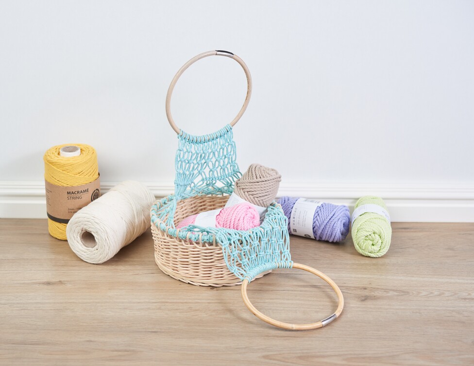 Teraz połącz ze sobą części makramy i trzciny. Ponownie namocz paliki. Umieść pierścień makramy na koszyku.