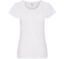 Dopasowana koszulka damska w kolorze białym ma okrągły dekolt i jest wykonana w 100% z bawełny. Świetna podstawowa koszulka o gramaturze materiału 135 g/m² do niestandardowych projektów tkanin.