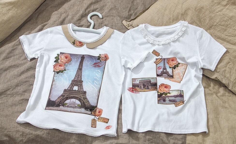 Nie tylko fani Paryża pokochają te koszulki. Dzięki dużym słomkowym motywom z jedwabiu i naszytej koronce wyglądają jak drogie designerskie produkty - a przecież są domowej roboty!