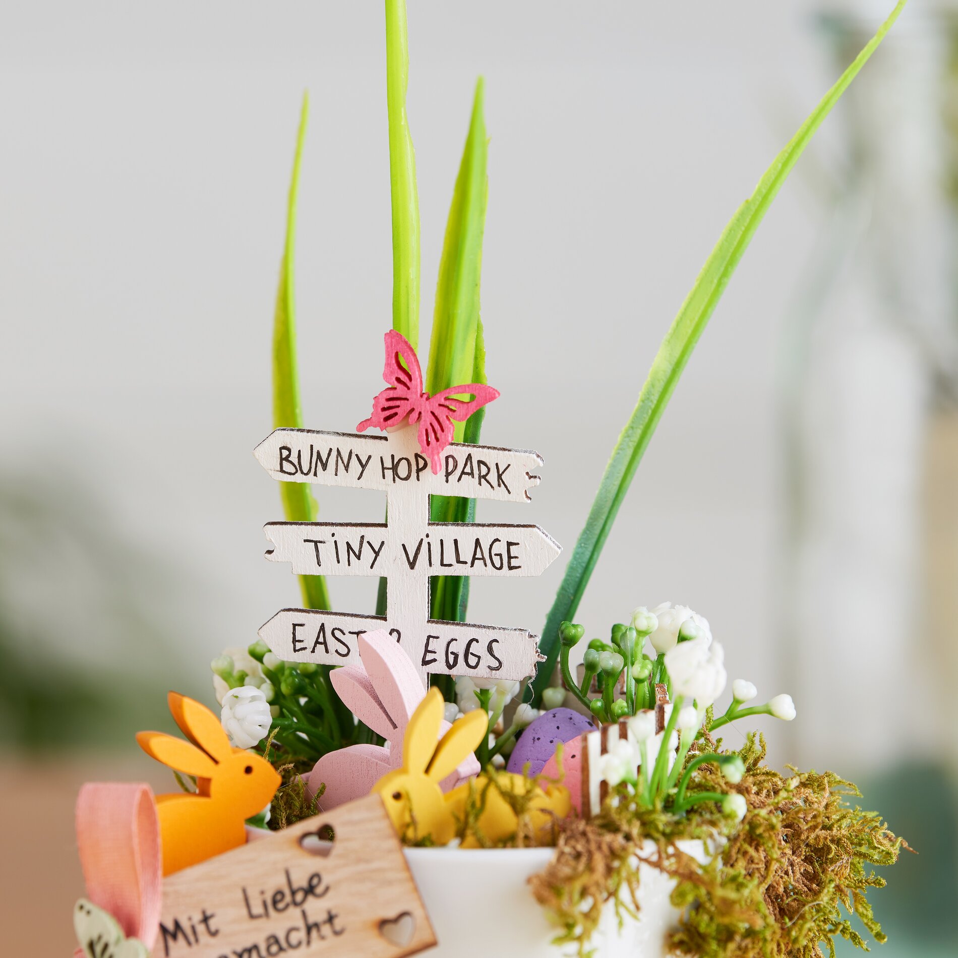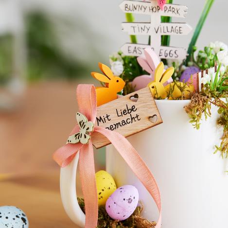 Teraz udekoruj kubek drogowskazem, elementem ogrodzenia i innymi drobnymi akcesoriami dekoracyjnymi, takimi jak małe pisanki, zajączki, kwiaty i inne porozrzucane przedmioty. Możesz łatwo przymocować wszystko na miejscu za pomocą gorącego kleju. Posypka "Made with love" i zawiązana kokardka na uchwycie kubka dodają tej dekoracji tego "czegoś".