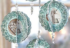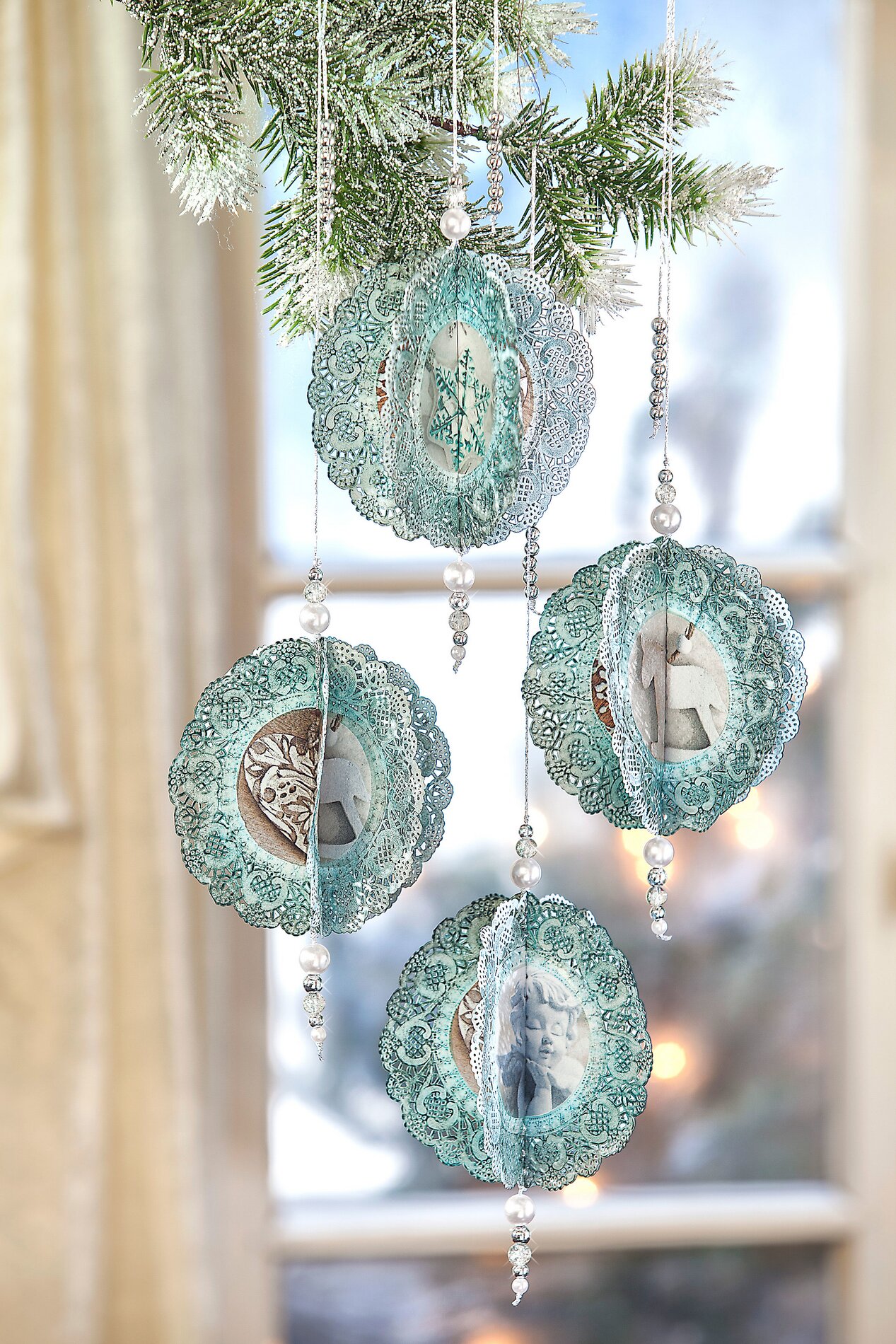 Te koronkowe papierowe bombki są tak lekkie, że mogą również pięknie wisieć na choince. Papiery są barwione tuszem do stemplowania i zszywane brokatowym sznurkiem. Świąteczne motywy na serwetkach dopełniają nostalgicznego wyglądu.