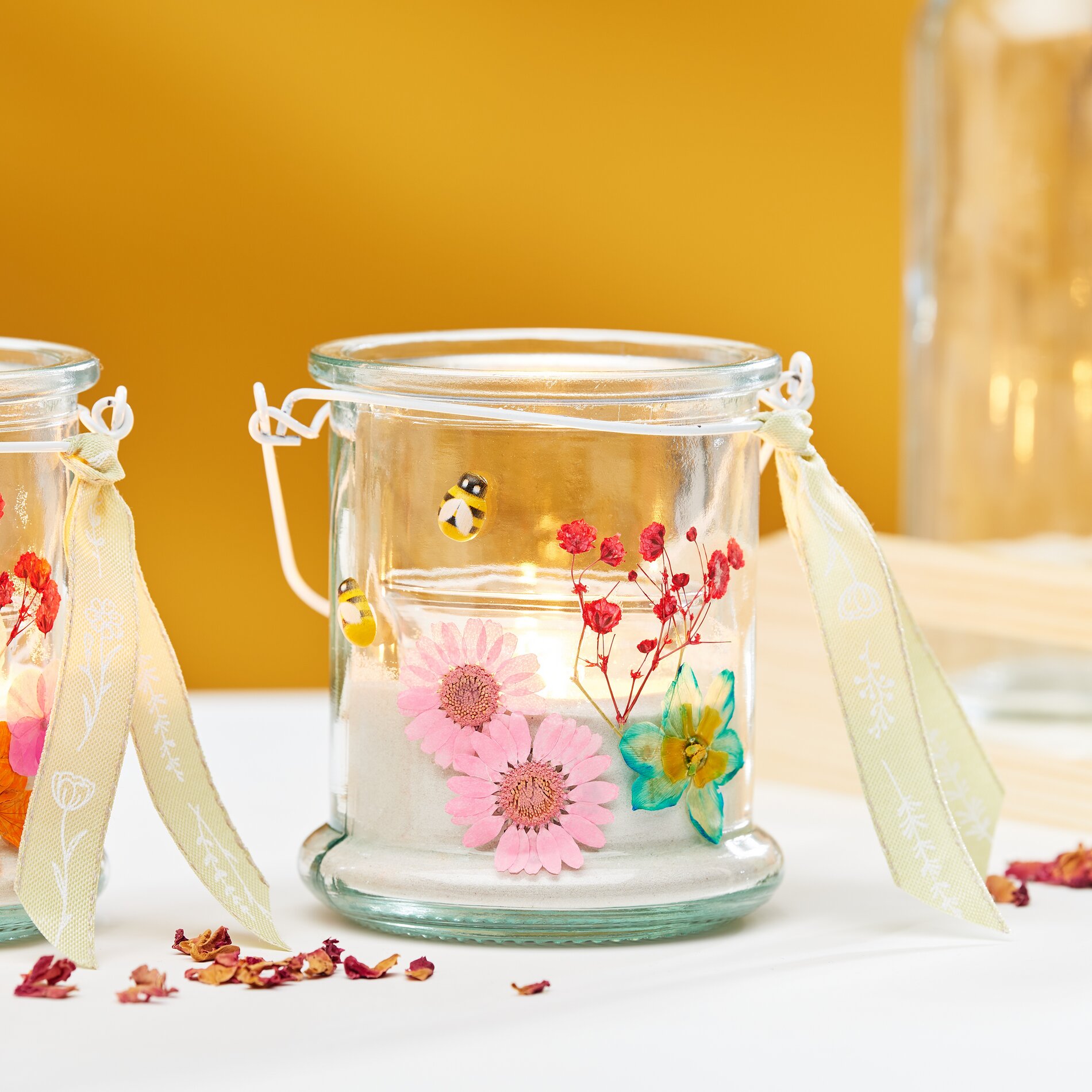 Gdy kwiaty i liście całkowicie wyschną, podnieś je. Rozprowadź trochę kleju rzemieślniczego z tyłu kwiatów. Upewnij się, że klej jest nałożony równomiernie, aby kwiaty dobrze przylegały, a następnie ostrożnie umieść je na latarni. Pozostaw klej do całkowitego wyschnięcia, aby zabezpieczyć kwiaty.