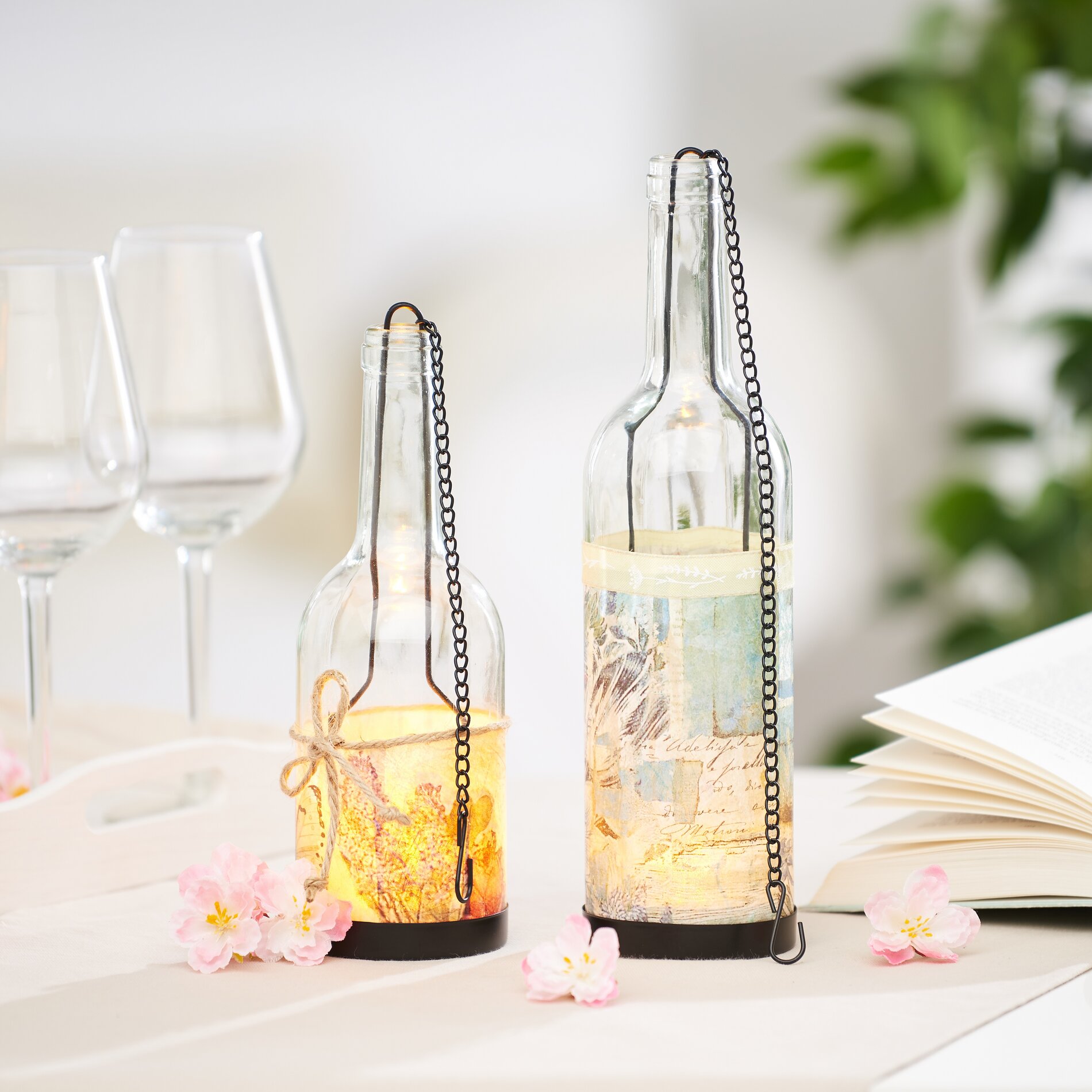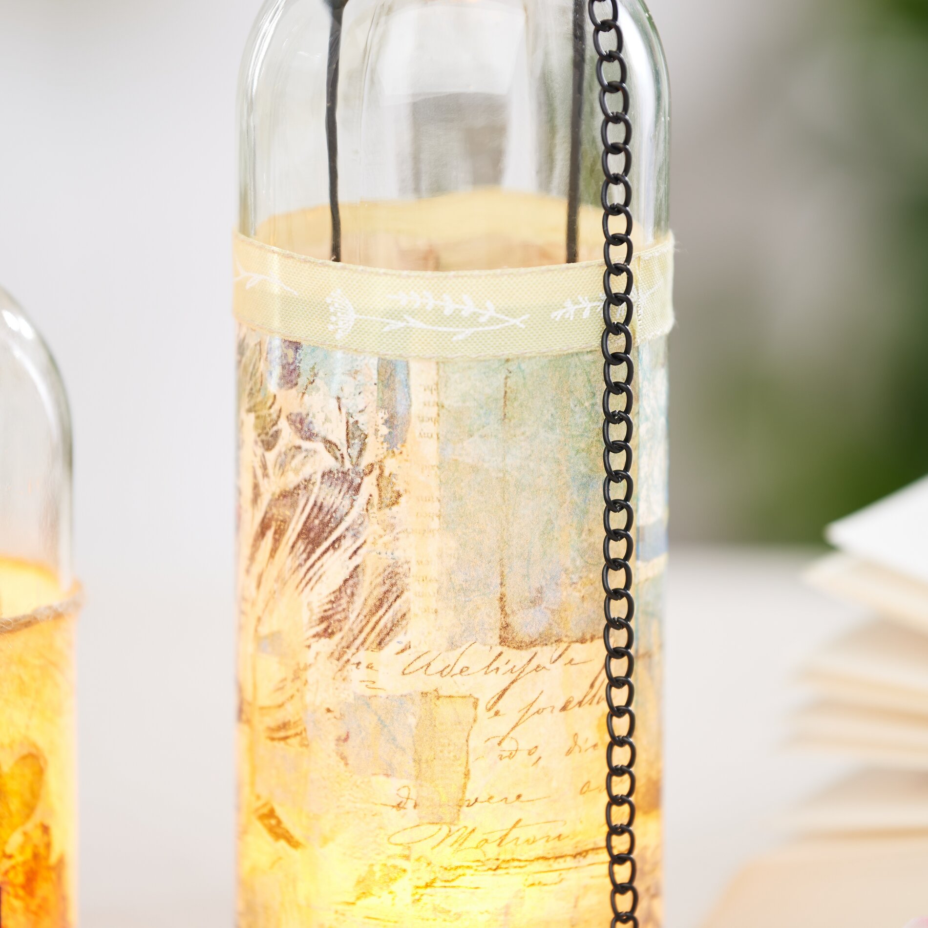 Tutaj dowiesz się, jak ozdobić lampiony w kształcie butelek za pomocą dekoracyjnego papieru do decoupage.