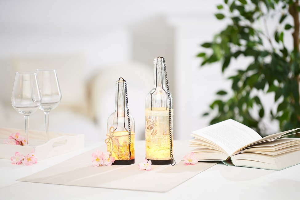 Jeśli teraz umieścisz lampkę LED w każdej butelce, Twoje lampiony będą gotowe do zawieszenia.