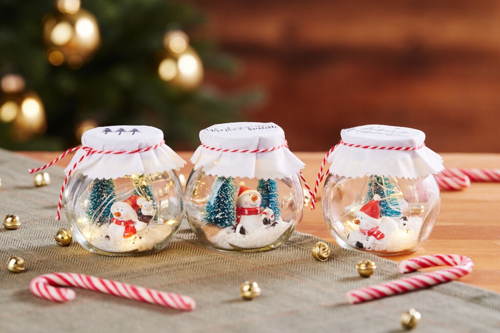 Miniaturowy świat w zakręcanym słoiku Najpierw umieść figurkę i choinki w słoiku i przymocuj je na miejscu za pomocą odrobiny gorącego kleju. Następnie dodaj do słoika