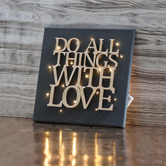 Napis "Do all things with love" wygląda szczególnie elegancko na czarnym tle. Dlatego blejtram o wymiarach 20 x 20 cm został najpierw zagruntowany czarną farbą akrylową.