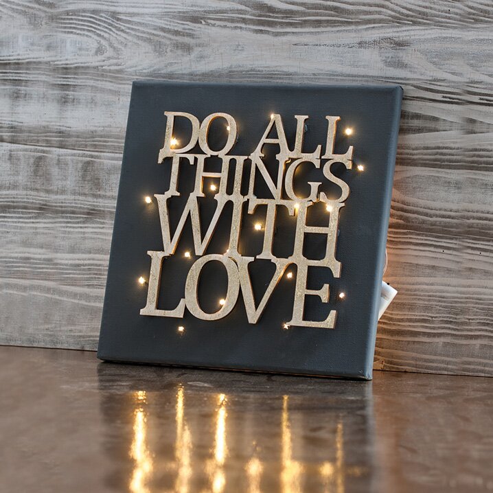 Jak tylko kolory wyschną, napis jest najpierw umieszczany na blejtramie jako test. Pozwoli to dokładnie określić, gdzie powinny być rozmieszczone małe lampki LED. Za pomocą skalpela wykonaj małą szczelinę na powierzchni ramy blejtramu dla każdej lampki. Przełóż lampkę przez każdą szczelinę od tyłu i przymocuj lampki za pomocą gorącego kleju.