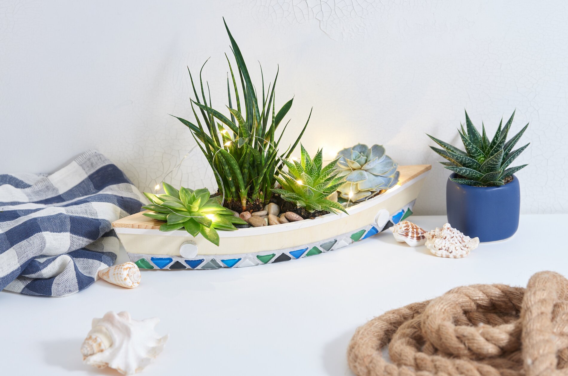 Najpierw pomaluj niektóre obszary łodzi białą farbą rzemieślniczą. Po wyschnięciu pokryj je miękką mozaiką szklaną według uznania.