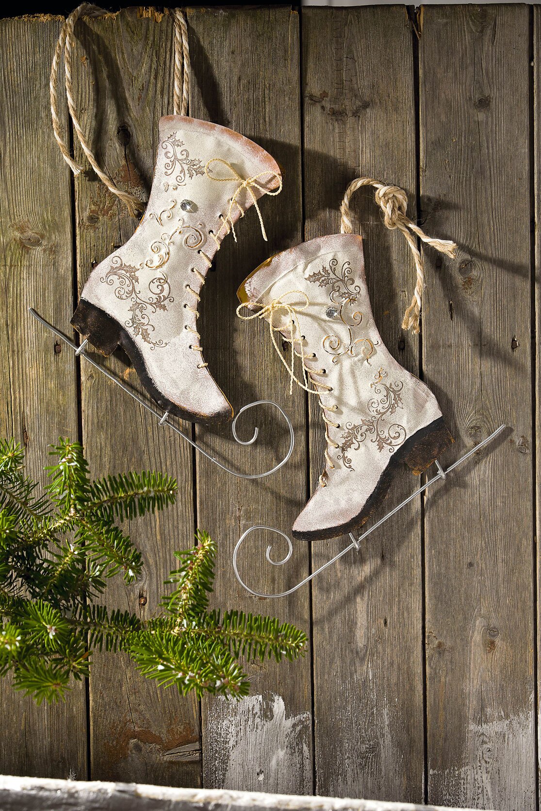 Nanieś antyczną białą farbę na buty i czarną farbę na podeszwy, a następnie wytłocz zwoje na białych butach i na pustych tylnych częściach butów i odrysuj je mocno za pomocą metalowego narzędzia do stemplowania. Następnie zeszlifuj wyraźne linie z przodu, aż metalowa blacha będzie ponownie widoczna. Uformuj buty w trójwymiarowy kształt za pomocą tylnej części łyżki.