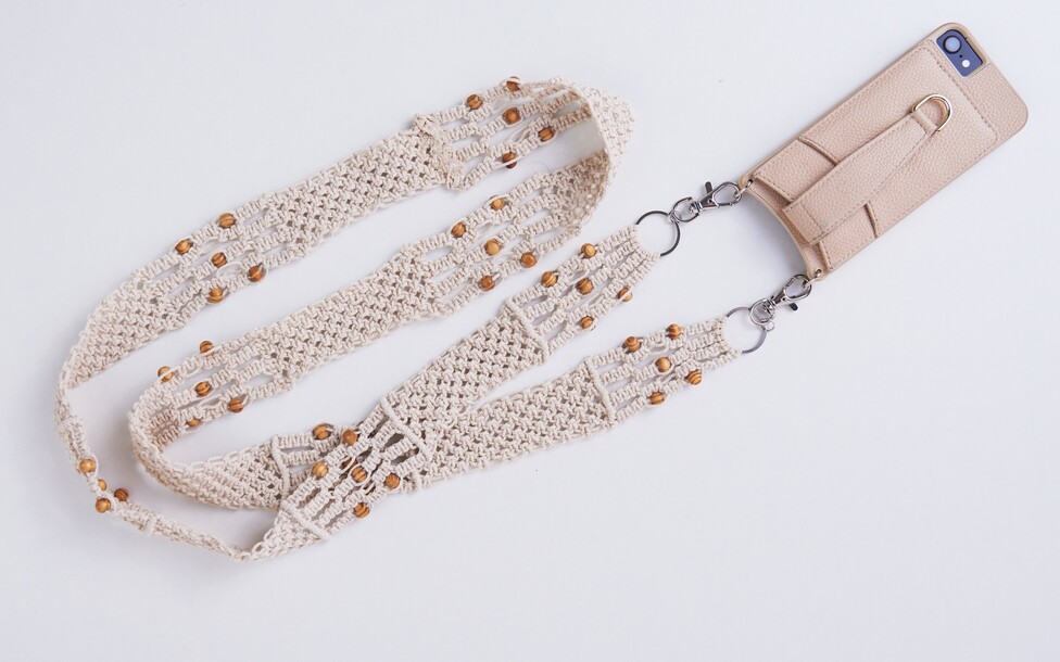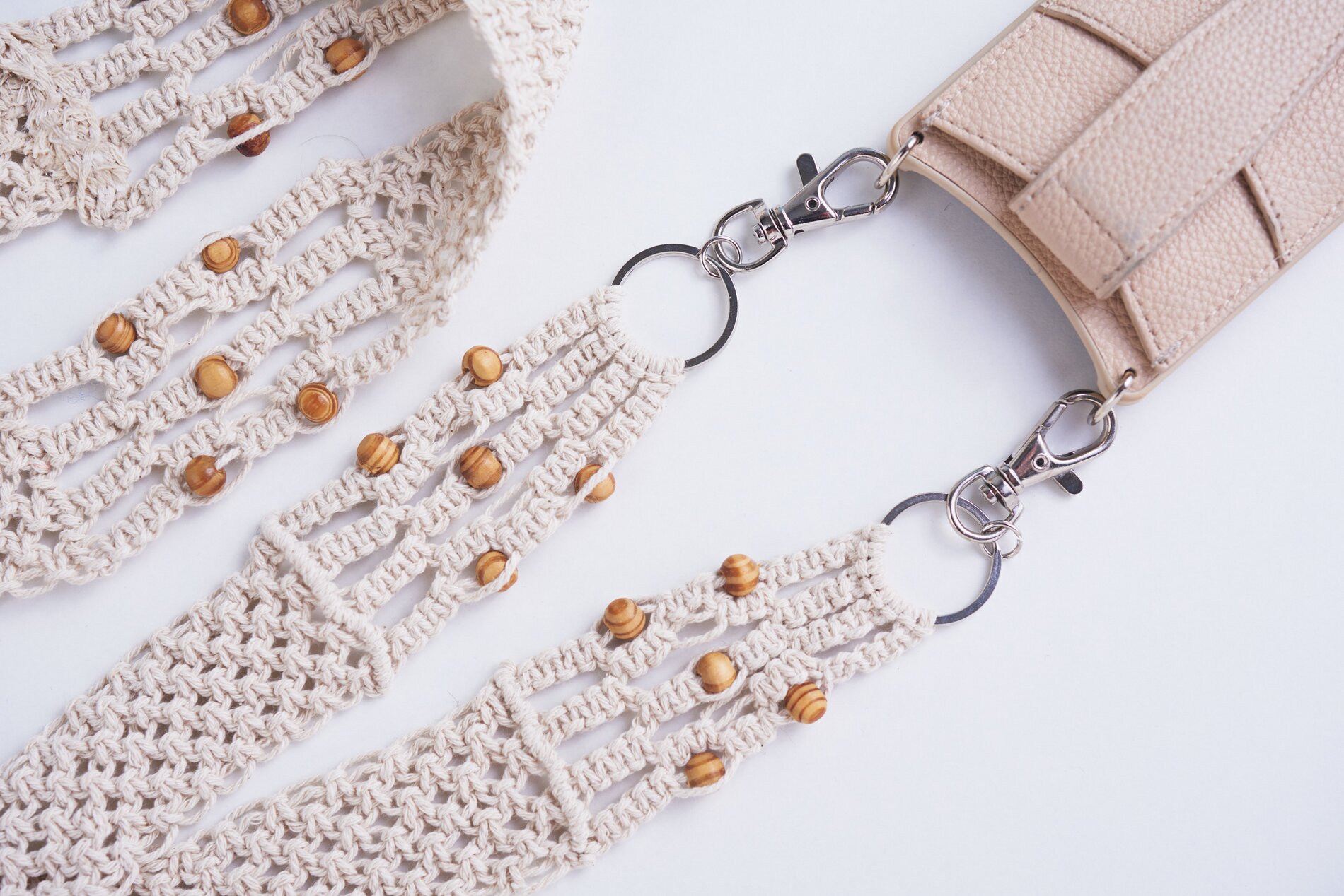 Zawiąż część A używając szablonu makramy z węzłami krzyżowymi. Rząd poziomych węzłów żeberkowych oddziela pierwszy wzór węzłów od drugiej części B. Powtarzaj wiązanie węzłów, aż uzyskasz wystarczająco długi łańcuszek do telefonu komórkowego. W przypadku drugiego breloczka również zacznij od zawiązania węzła w kształcie głowy skowronka i zawiąż wzór na chwilę.