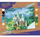 Malowanie po numerach "Zamek Neuschwanstein" o wymiarach ok. 38,2 x 29,2 cm. Zestaw zawiera 1 wydrukowany szablon do malowania, 12 kolorów, 1 pędzel i 1 zestaw instrukcji.