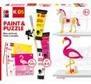 Marabu KiDS Little Artist Paint & Puzzle "Flaming i Jednorożec" z mnóstwem treści i mnóstwem zabawy! Kto nie marzy o flamingu jako zwierzątku domowym? Albo jeszcze lepiej o jednorożcu! Ten czarujący zestaw zawiera dwa wdzięczne stworzenia. A co najlepsze, nie ma żadnych ograniczeń dla Państwa wyobraźni, jeśli chodzi o ich kolorowanie. Ten zestaw z drewnianymi puzzlami 3D to świetna zabawa dla całej rodziny, z pędzlami, kolorowankami Little Artist i farbami dla dzieci w wieku od 4 lat. Wymiary motywu flaminga to 12,5 x 21,7 cm, a jednorożca 17 x 20 cm.