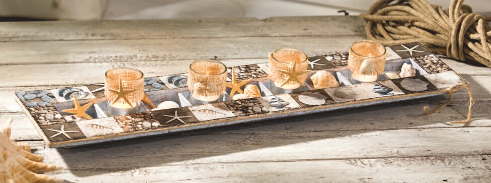 Wytrzymała miska z papier-mâché o wyraźnych kształtach jest idealna do projektowania techniką serwetkową. Poszczególne przegródki z motywami mają odpowiedni rozmiar dla szerokiej obręczy. Przegródki ozdobione są muszelkami i świeczkami.
