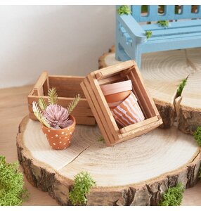 3. Kolorowanie kratki na rośliny i kratki na owoce Aby nadać miniaturowemu ogrodowi naturalny wygląd, proszę zmieszać brązową farbę z wodą. Proszę pomalować tą mieszanką kratki na rośliny i miniaturowe drewniane schodki na owoce i pozostawić do całkowitego wyschnięcia. Rozcieńczony kolor sprawia, że struktura drewna pozostaje widoczna i nadaje elementom autentyczny i naturalny wygląd.