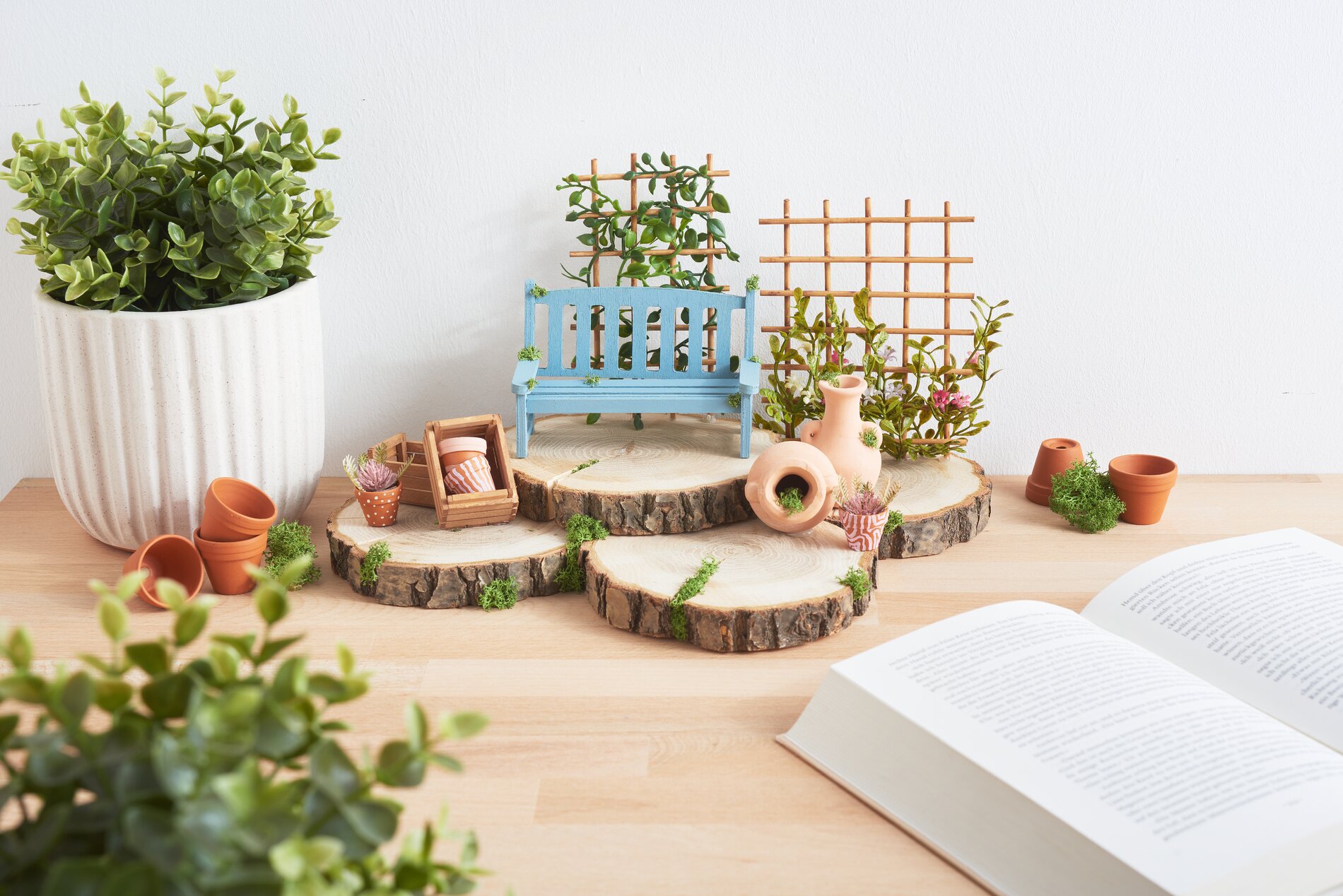 6 Wykończenie miniaturowego ogrodu Krążki VBS "Okrągłe" krążki drzewa są teraz łączone za pomocą gorącego kleju. Jak tylko klej wyschnie, tworzą one stabilną podstawę dla innych elementów dekoracyjnych: proszę umieścić własnoręcznie wykonane elementy dekoracyjne, takie jak ławka ogrodowa, doniczki z terakoty i kratka kwiatowa na krążkach drzewa zgodnie z własnymi pomysłami i również przymocować wszystko na miejscu za pomocą gorącego kleju. Aby dopełnić całości, można na koniec dodać mech w różnych miejscach.