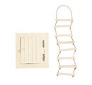 Zabawny miniaturowy wyłaz dachowy i drabina linowa wykonane ze sklejki. Wyłaz dachowy ma ok. 8,8 cm szerokości, ok. 9,5 cm wysokości i ok. 1,6 cm grubości. Drabinka linowa ma ok. 5 cm szerokości, ok. 20 cm długości i ok. 5 mm grubości szczebli.