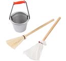 Miniaturowy zestaw do sprzątania składa się z miotły i mopa o długości ok. 7 cm oraz wiadra o wielkości ok. 2 cm. Miniatury są wykonane z metalu i drewna.