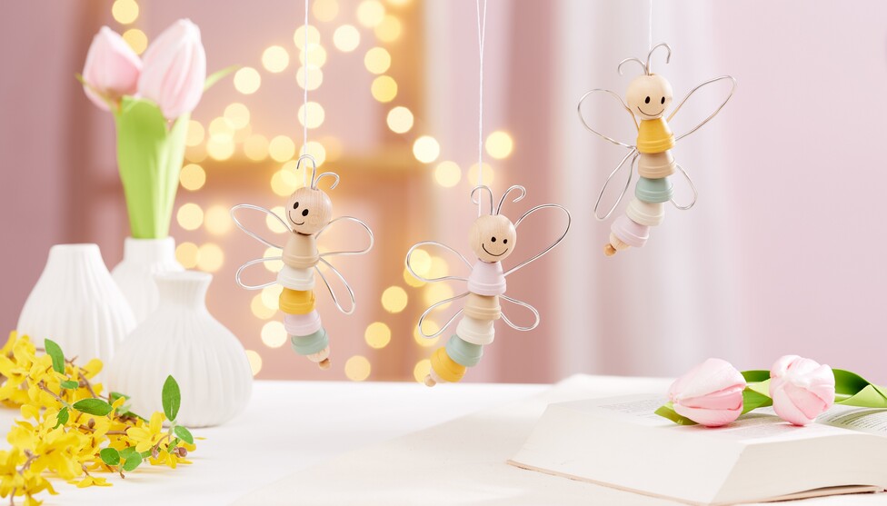Zagnij nadmiar drutu w czułki i przymocuj je do kulki 30 mm za pomocą gorącego klej u. Uformuj skrzydła za pomocą kolejnego kawałka drutu i przywiąż je do nitki osnowy. Zawiąż dodatkową nitkę pod głową w celu zawieszenia.
