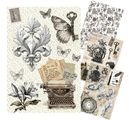 Odkryj artystyczny świat kreatywności dzięki Motyw papier ryżowy asortyment "Typographic". Ten zestaw 4 nici przeniesie Państwa do eleganckiej palety kolorów beżu, brązu i czerni, ozdobionej motywami takimi jak motyle, ornamenty i zabytkowe maszyny do pisania.