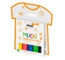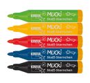 Kredki do tkanin Mucki w zestawie 5 sztuk w kolorach żółtym, czerwonym, niebieskim, zielonym i czarnym, o szerokości linii ok. 2-5 mm.