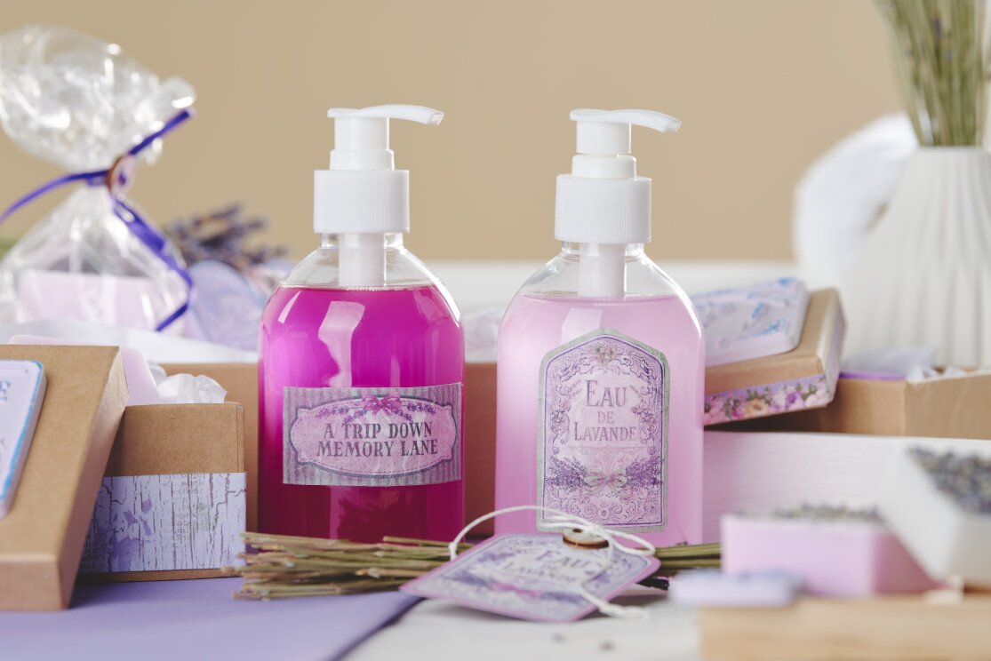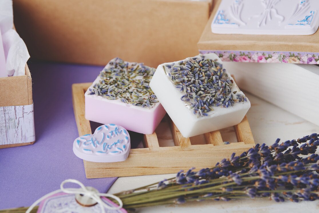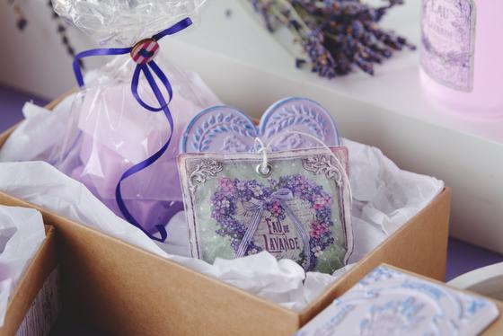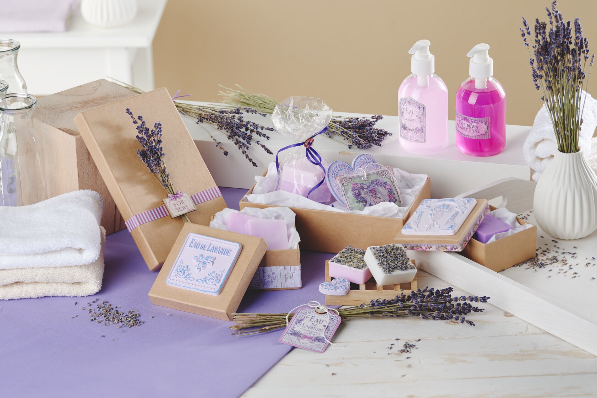 Z pomocą słomianego jedwabiu, wycinanych laserowo motywów i bukietów lawendy, fajnie jest stworzyć pięknie zdobione opakowania prezentowe na mydła ze zwykłych kartonowych pudełek.