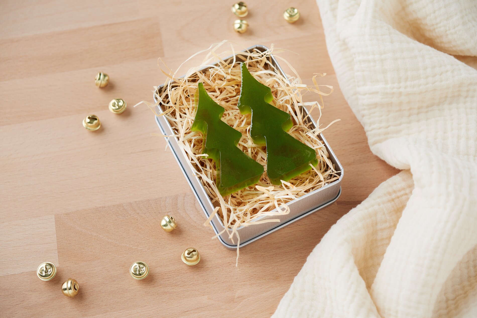 Gdy mydło zastygnie, ostrożnie wyjmij je z silikonowej formy w kształcie choinki. Aby uzyskać szczególnie atrakcyjną prezentację, możesz umieścić mydło w metalowej puszce z wełną drzewną. To ładne opakowanie chroni mydło i sprawia, że jest ono idealnym prezentem świątecznym.