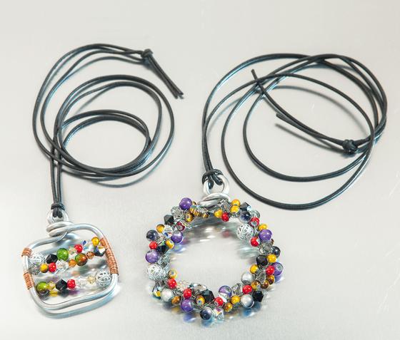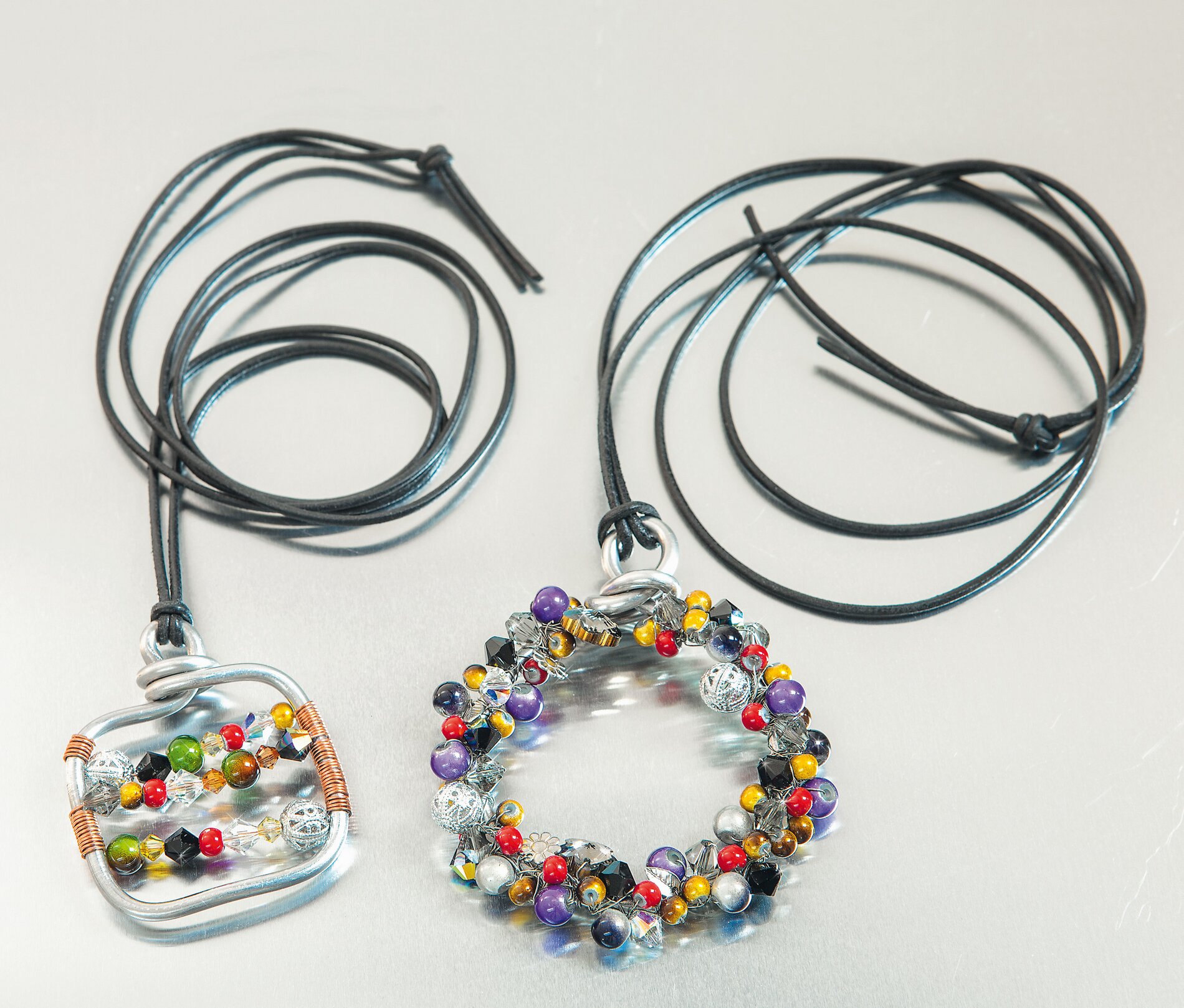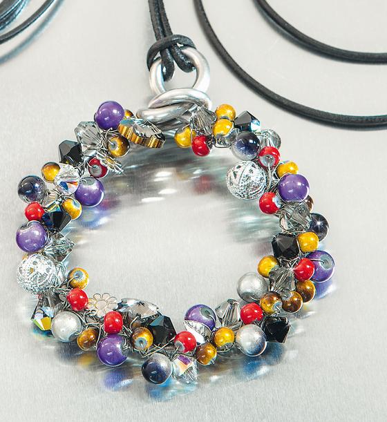 W przypadku okrągłego wisiorka, nawlecz kolorową mieszankę filigranowych koralików Swarovski i aluminium, koralików Miracle Beads i zawieszek z kamieni szlachetnych na drut z efektem bulionu i owiń je ciasno wokół drucianego pierścienia, aż zostanie całkowicie pokryty. Skróć końcówkę, aby pasowała i dociśnij.