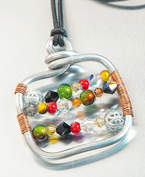 W przypadku prostokątnego wisiorka, nawiń miedziany drut sześć razy wokół jednej strony wisiorka, następnie nawlecz filigranowe koraliki Swarovski i aluminium oraz koraliki Miracle Beads, przeciągnij drut przez środek i nawiń go 11 razy wokół drugiej strony wisiorka.