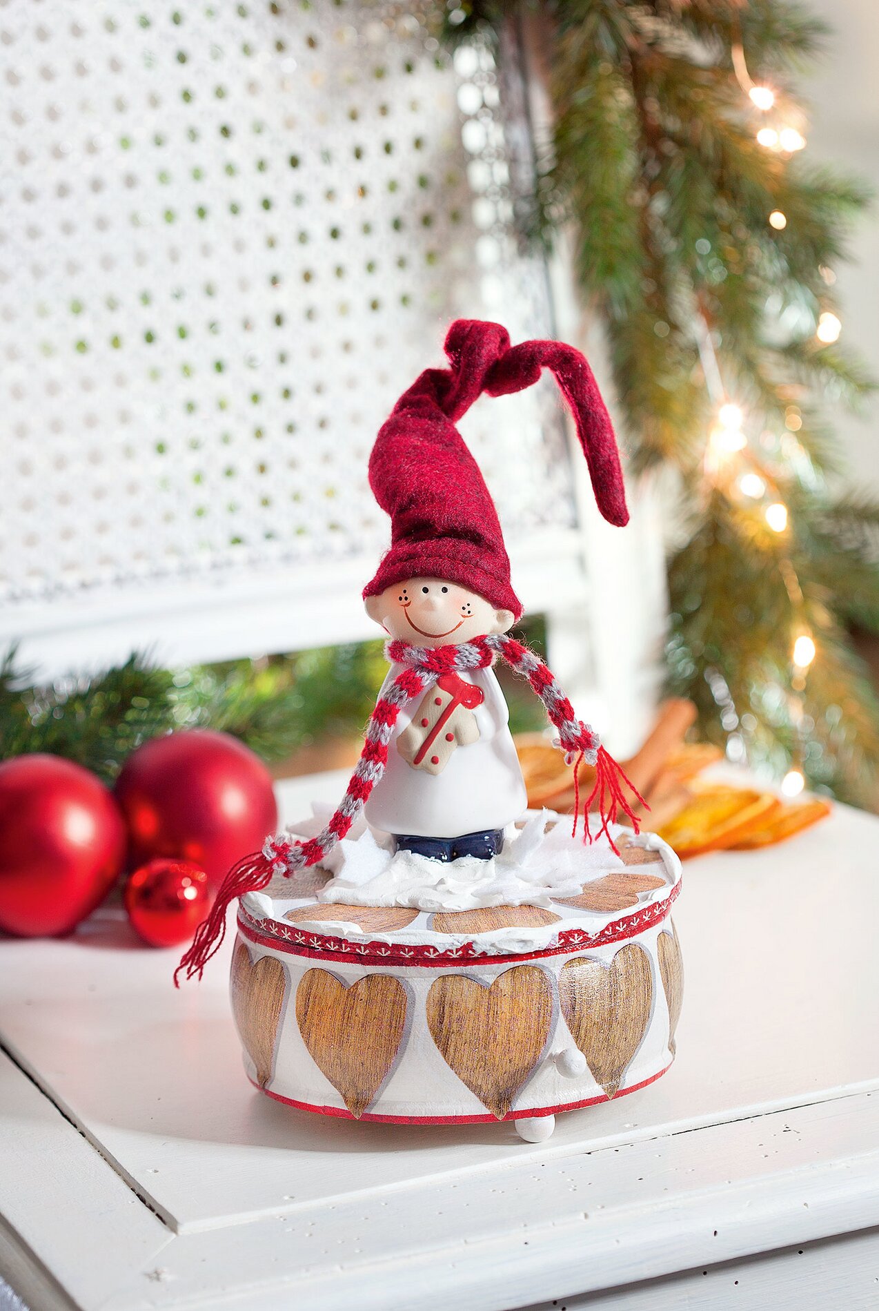 Ten mały elf w skandynawskim stylu z dzianinowym szalikiem i czerwoną spiczastą czapką znajduje idealną scenę na tej pozytywce. Zaaranżowana w zimowym stylu z dekoracyjnym śniegiem i małymi posypkami, ta dekoracja jest idealna do skrócenia zimnych dni swoją melodią. Małe serduszka i czerwono-biały wzór idealnie pasują do nordyckiego stylu, nadając klasycznej, nostalgicznej pozytywce nowoczesny wygląd.