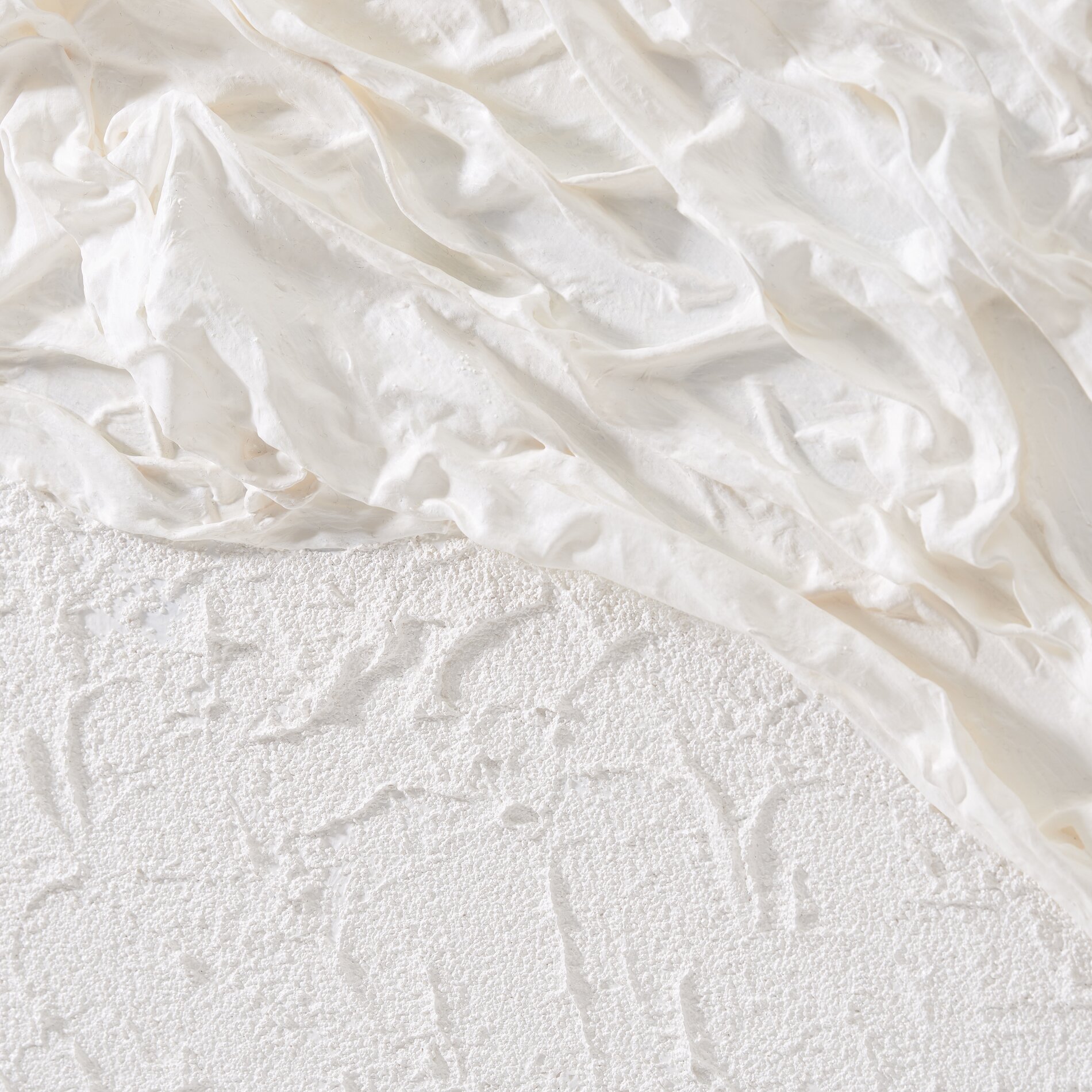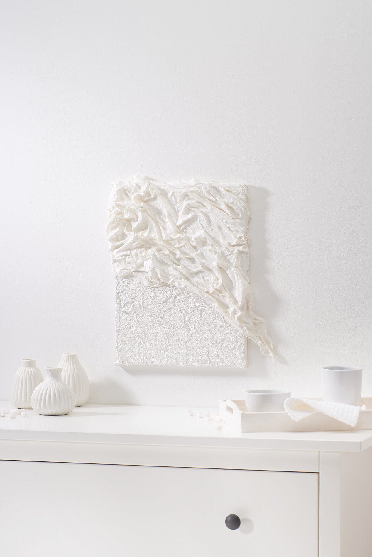 Do wykonania tego teksturowanego obrazu potrzebna będzie jedwabna tkanina o wymiarach 55 x 55 cm. Obficie pokryj tkaninę usztywniaczem do tkanin. Natychmiast połóż go na ramie blejtramu w artystycznych fałdach, aby uzyskać ekscytujący wygląd 3D. Pozostaw do wyschnięcia na około 6 x 8 godzin.