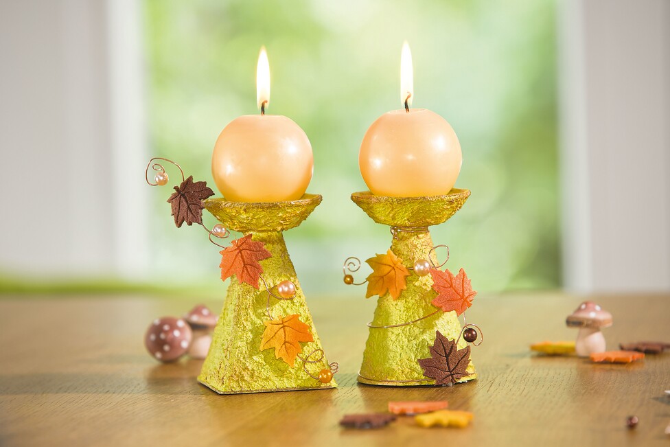 Nawlecz koraliki do smaku i przymocuj filcowe liście gorącym klejem, jednocześnie mocując ozdobiony drut do świecznika.