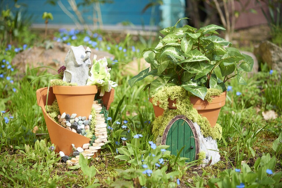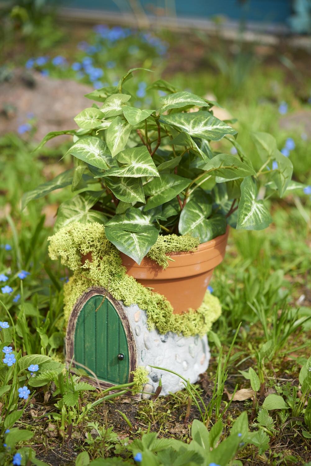 Mała doniczka z terakoty na górze jest wypełniona piaskiem lub sadzonkami. Umieść samodzielnie wykonany domek w doniczce. Na koniec wypełnij luki