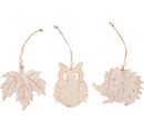Zestaw zawiera trzy zawieszki: liść klonu (9 x 10 cm), jeża (11 x 8 cm) i sowę (10 x 7 cm), wszystkie z praktyczną jutową wstążką i ozdobnym drewnianym koralikiem. Czy to na oknach, gałęziach w wazonie, drzwiach, wieńcach czy jako dekoracja stołu - te zawieszki przyciągają wzrok.