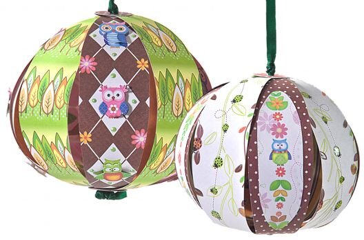 Wytnij 8 podstawowych kształtów na kulę i odpowiednią liczbę ozdób, a następnie przyklej je do podstawowych kształtów. Użyj dziurkacza do oczek, aby zrobić otwór na górze i na dole każdego kształtu podstawowego. Następnie wytnij dwa papierowe krążki o średnicy 25 mm i zrób otwór w środku każdego z nich.