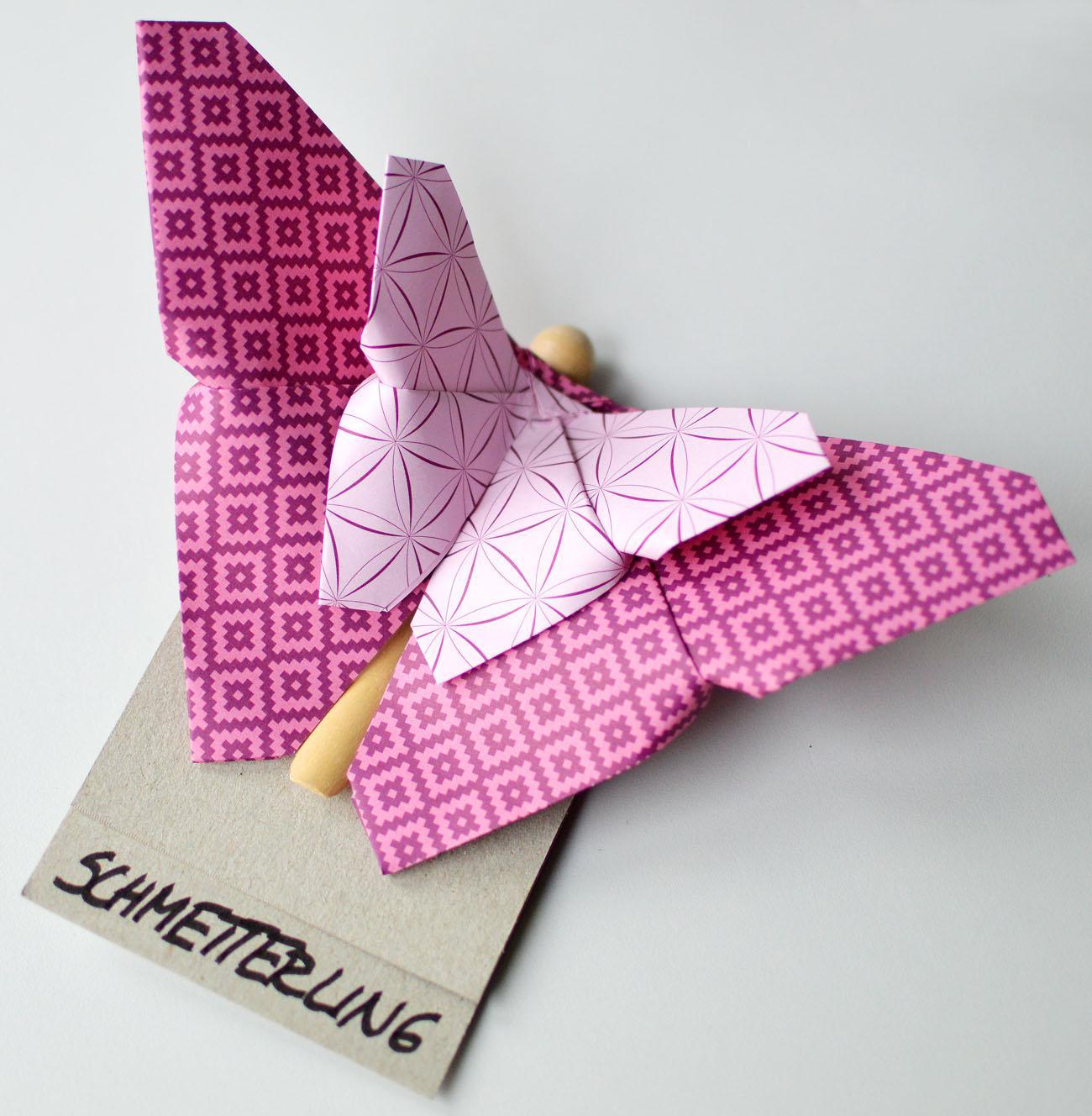 Gratulacje! Twój pierwszy motyl origami jest gotowy. Możesz teraz wybrać inny rozmiar papieru, aby dodać drugiego motyla. Efekt trójwymiarowości zostanie wzmocniony, a ty możesz kreatywnie wykorzystać kolory i wzory papieru. Gotowe papierowe motyle można teraz przykleić do wieszaków na ubrania. Praktyczne jest to, że nostalgiczny spinacz do ubrań już wygląda jak ciało motyla.