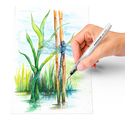 Wytrzymała nylonowa końców ka jest szczególnie stabilna wymiarowo, a pędzle nadają się do wszystkich farb na bazie wody. Miękki trz onek i system zaworów gwarantują równomierne uwalnianie wody. Lekki nacisk na trzonek sprawia, że woda wpływa do włosia pędzla w kontrolowany sposób, zapewniając doskonałe rezultaty w projektowaniu akwareli. Imponujące krajobrazy, sceny i motywy artystyczne zyskują wspaniały wygląd dzięki efektom akwareli.