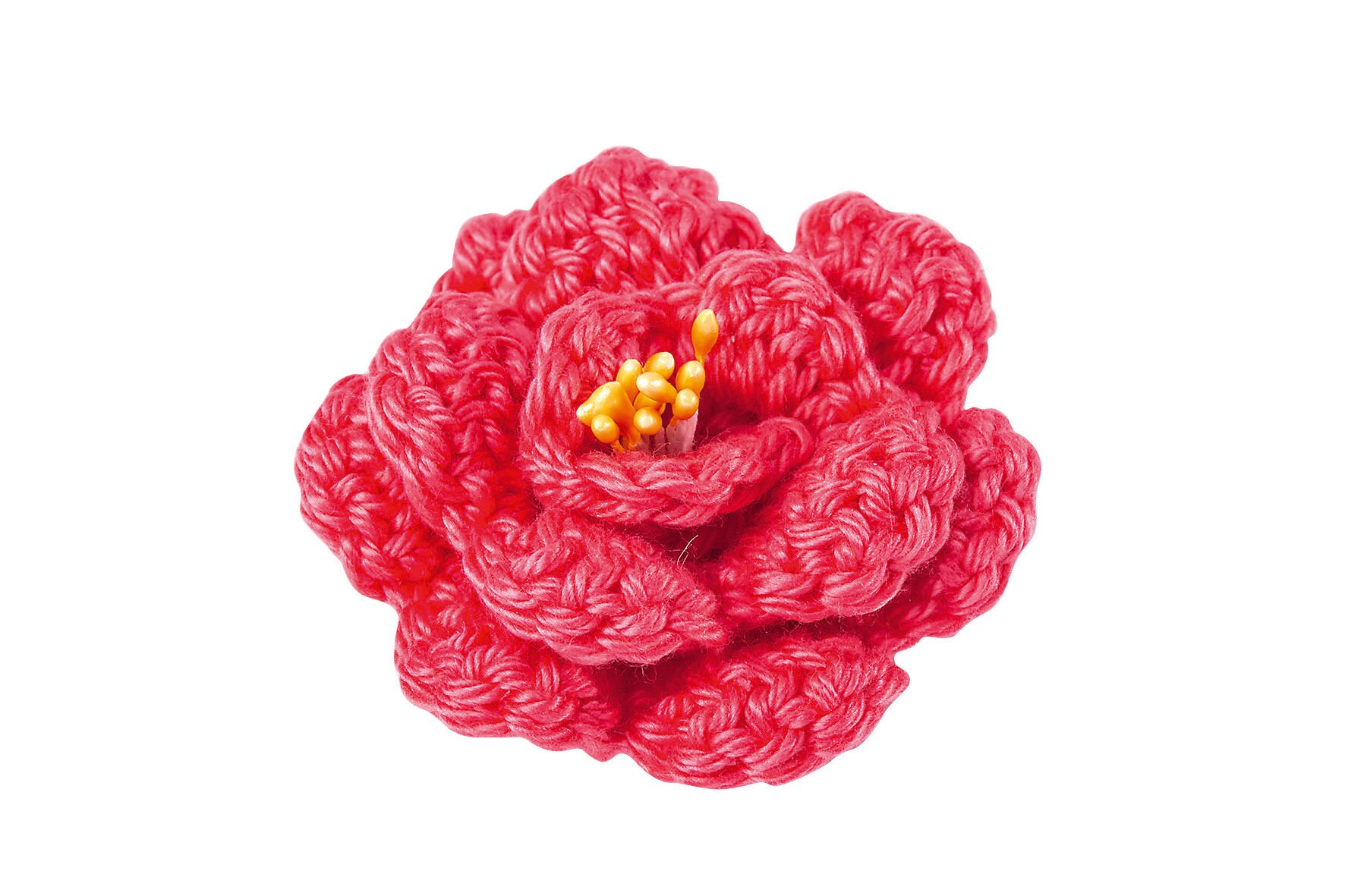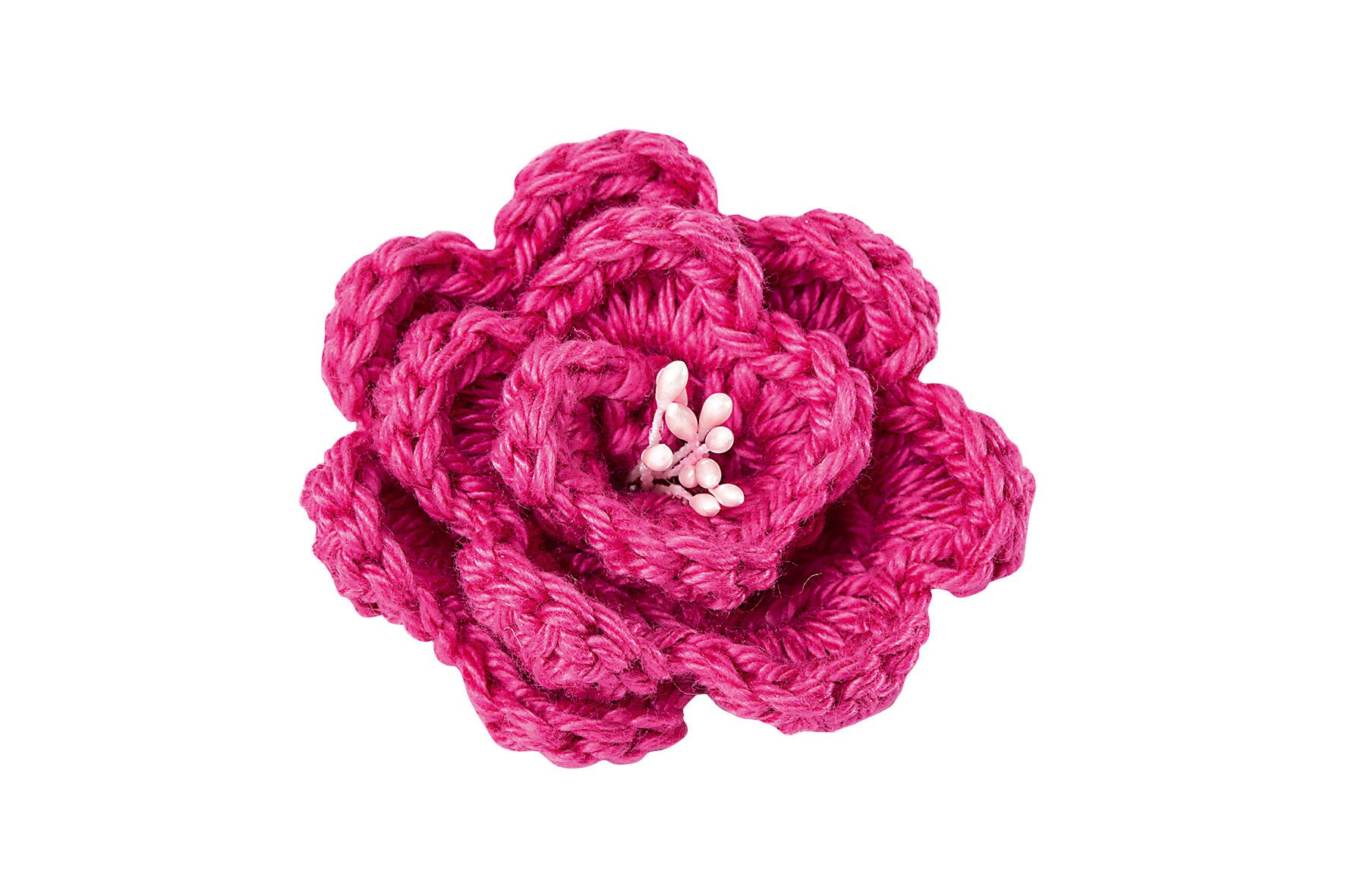 Przeciągnąć nitkę przez ostatnie oczko, odciąć i schować. Zagiąć 5 słupków na środku każdego kwiatu i umieścić je na końcu z mniejszymi płatkami. Zwinąć szydełkowany kwiat i zszyć razem z nitką początkową. Przeszyj również pętelkę słupków.