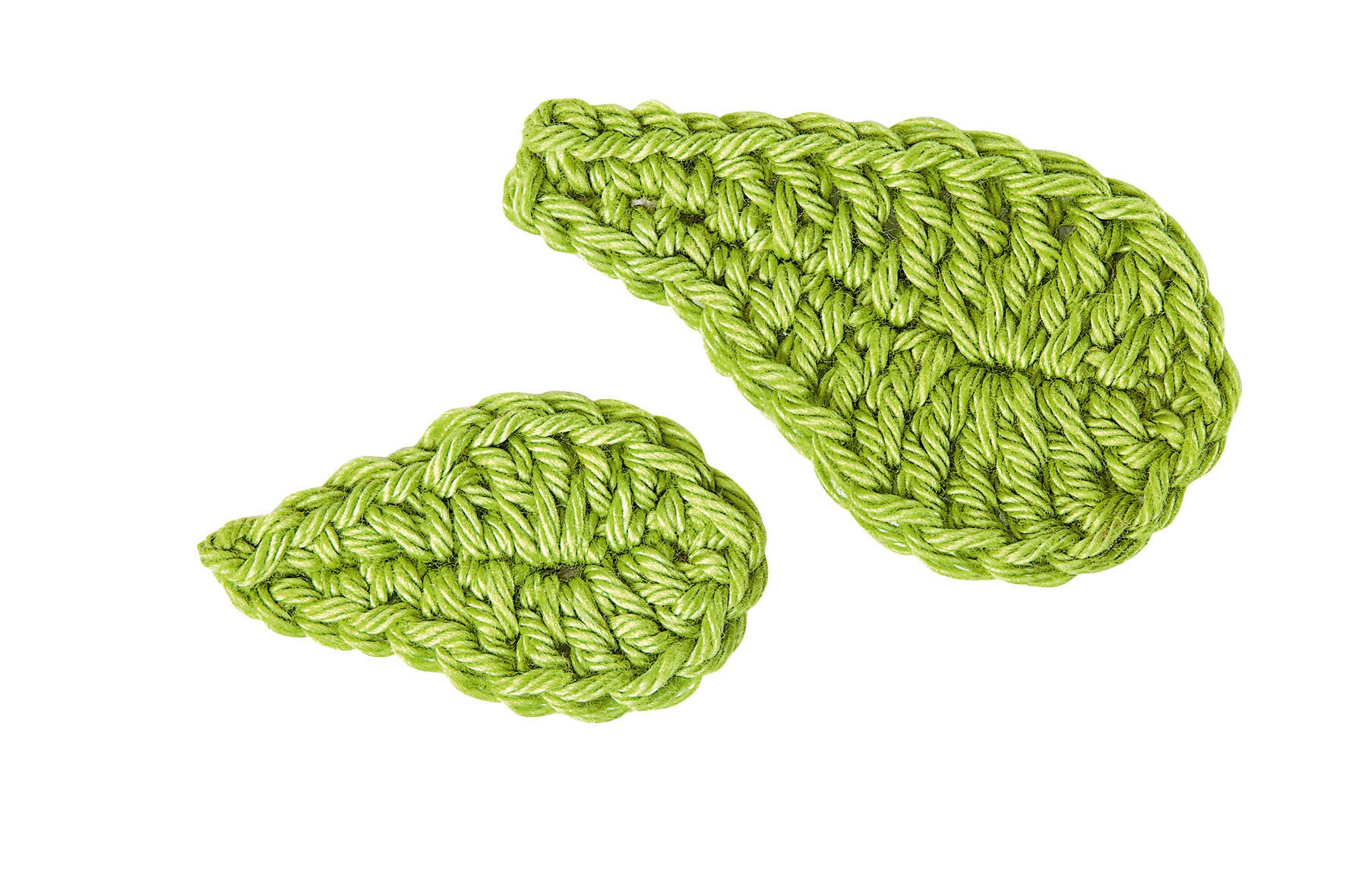 Przerabiać na szydełku listki w różnych rozmiarach z zielonej włóczki, nabrać 13 o. Przerabiać na szydełku oczka łańcuszka: 1 oczko zamykające (łańcuszek), 3 oczka ścisłe, 3 sł, 1 oczko ścisłe podwójne, 3 oczka ścisłe podwójne w następne oczko ścisłe, 1 oczko ścisłe podwójne, 1 sł, 1 oczko ścisłe obrócić robótkę i przerabiać na szydełku w ten sam sposób z drugiej strony oczka łańcuszka. Przeciągnąć nitkę przez ostatnie oczko, odciąć i zakończyć obie nitki. Małe listki są przerabiane na szydełku przez 9 oczek: 1 sc, 3 dc, 1 półsłupek, 3 tr w 1 sc, 1 półsłupek, 1 dc, obrócić i przerabiać szydełkiem wstecz.