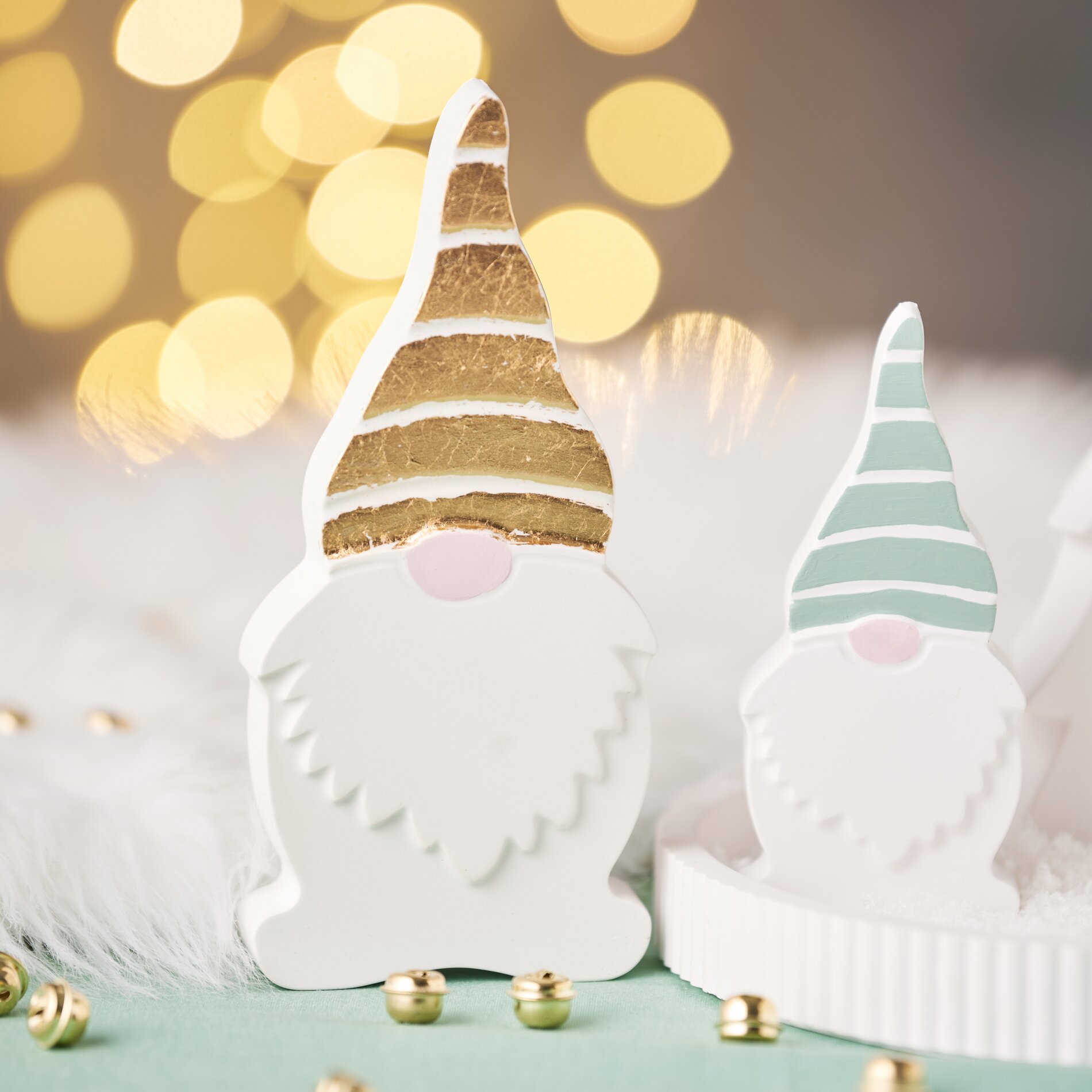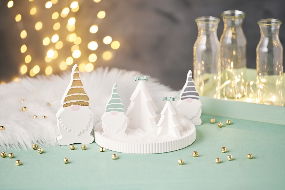 Teraz zaczyna się część kreatywna: pomaluj krasnale farbami akrylowymi według własnego pomysłu, aby nadać im osobowość i charakter. Aby jeszcze bardziej upiększyć swoją aranżację, udekoruj jodły i elfy na talerzu dekoracyjnym śniegiem i brokatem. Stworzy to błyszczące, zimowe akcenty. Aby ukoronować aranżację, dodaj jej uroku za pomocą kokardek z satynowej wstążki na czubkach jodeł. Aby wykonać kokardę, przyklej dwa pierścienie o różnych średnicach jeden na drugim i zabezpiecz je kawałkiem pośrodku.